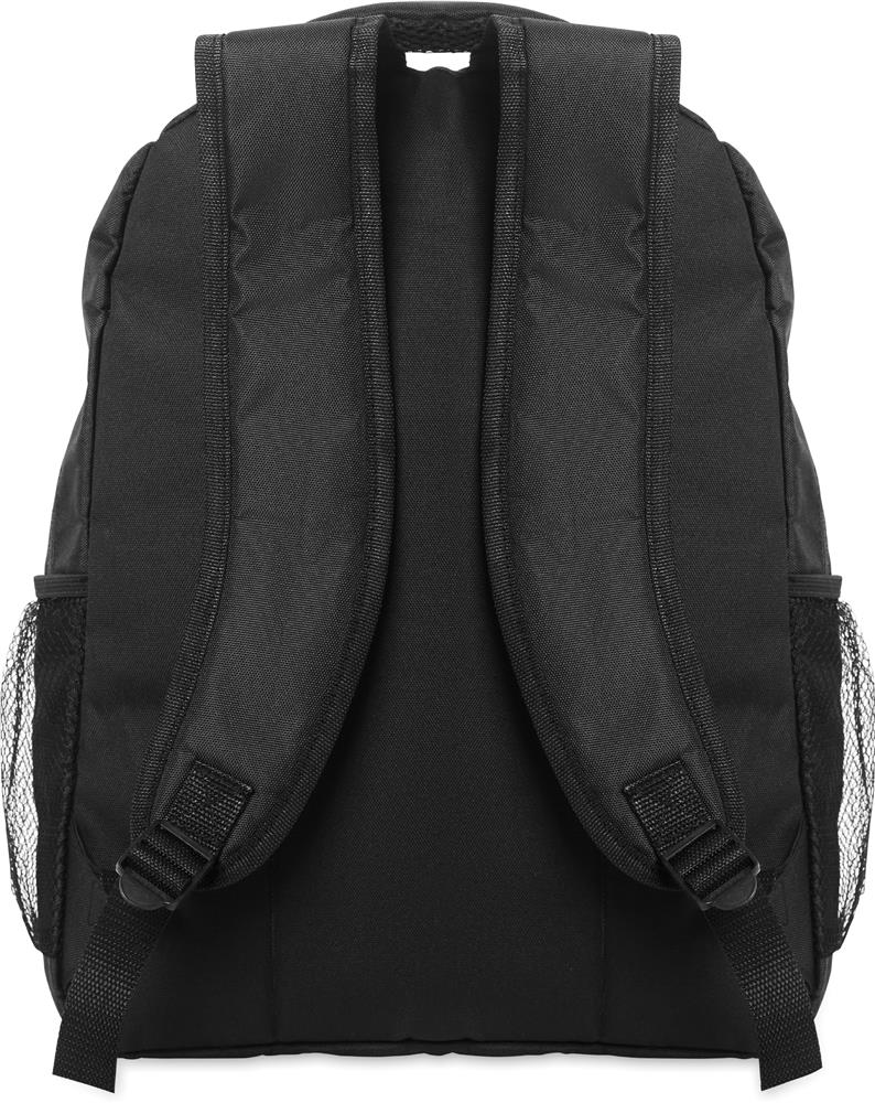 15'' Laptop-Rucksack aus 600D RPET-Polyester mit gepolstertem Laptopfach. Beidseitige Netztaschen und Reißverschlusstasche vorne.