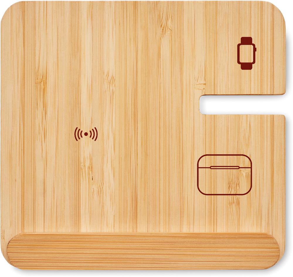 3in1 faltbare Ladestation im Gehäuse aus Bambus mit Smartphone-Halter. Inkl. kabelloses Dual-Coil-Ladegerät (15 W), Smartwatch-Ladegerät (nur Apple®) und TWS-Ladegerät.