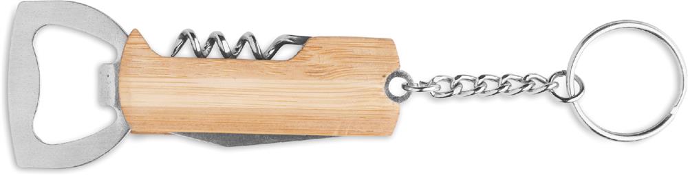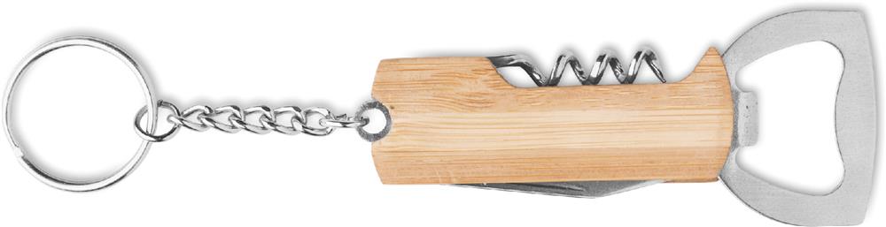 3in1 Multifunktionstool mit Griffteil aus Bambus und Schlüsselring. Inkl. Kapselheber, Korkenzieher und Taschenmesser.