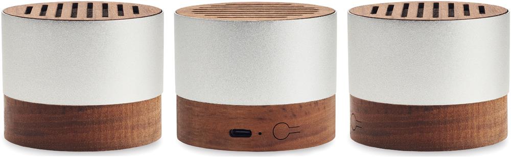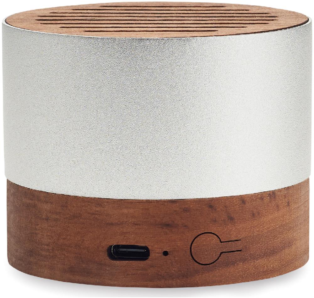 5.3 wireless Lautsprecher. Gehäuse aus recyceltem Aluminium mit Details aus Walnussholz. Inkl. 1 wiederaufladbarer Li-ION-Akku mit 300 mAh. Ausgangsdaten: 3 W, 3 Ohm und 5 V. Spielzeit ca. 3 Stunden.