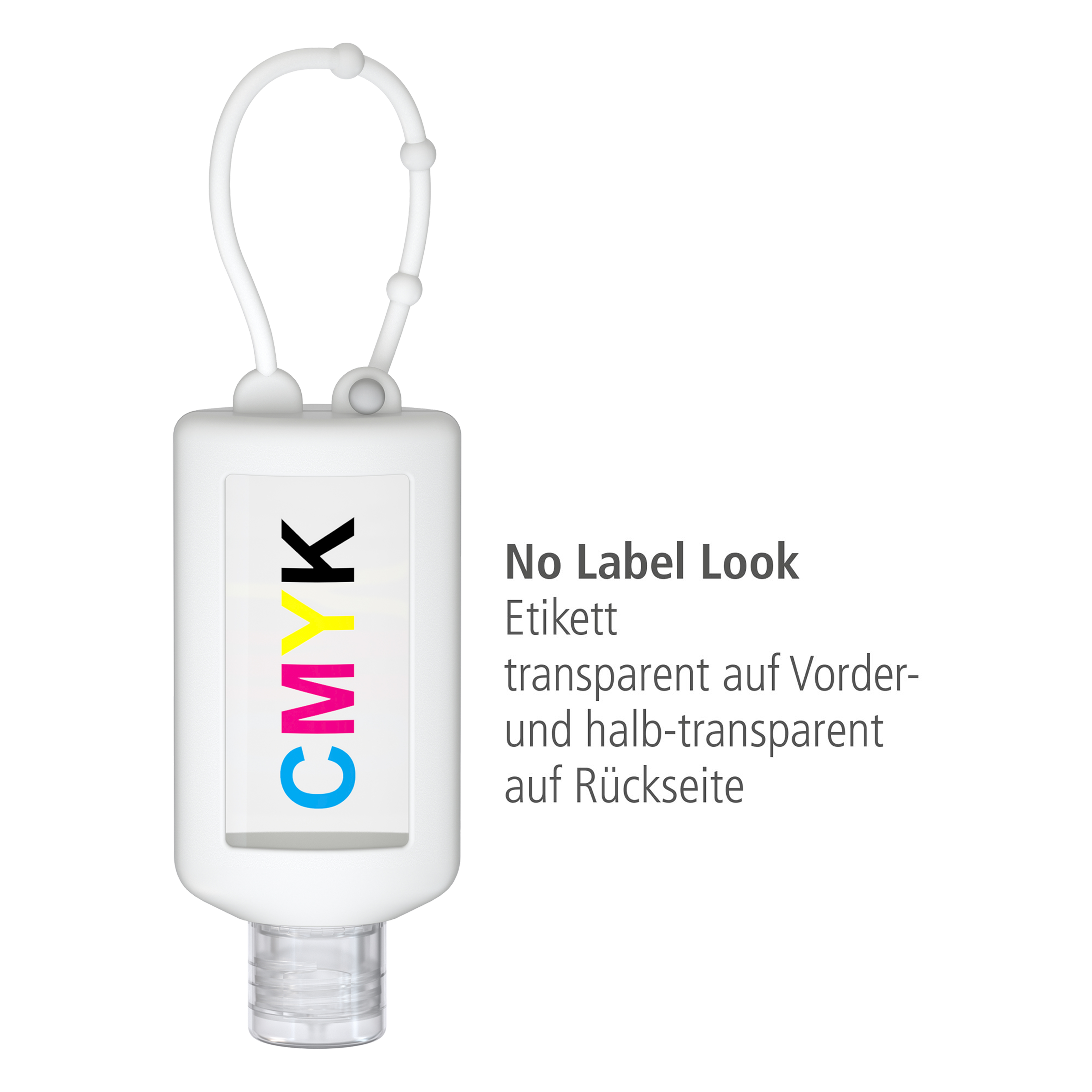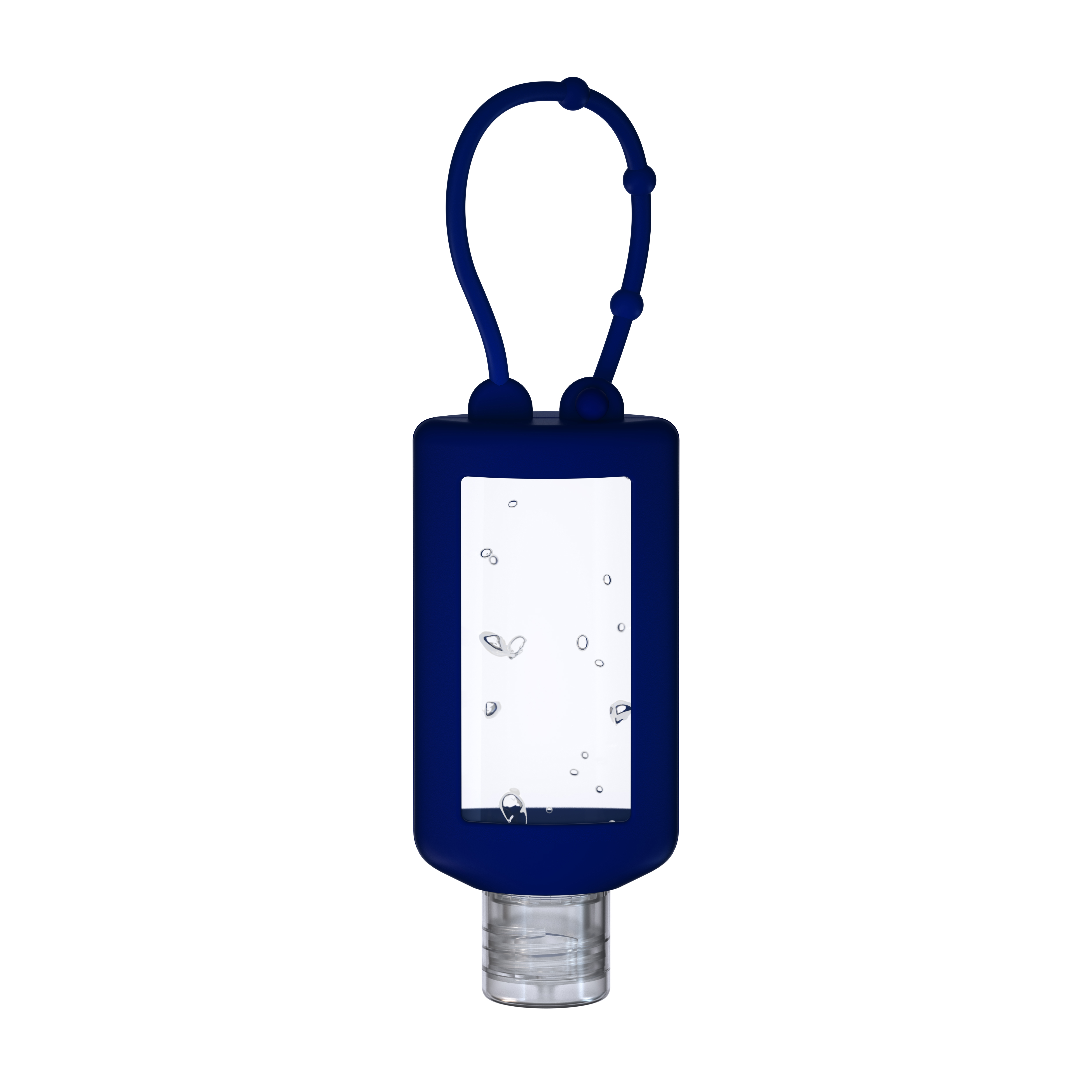 50 ml Flasche kristallklar, Klappdeckel (zufällig ausgerichtet) natur-transparent, Silikonhülle und Schlaufe in blau.