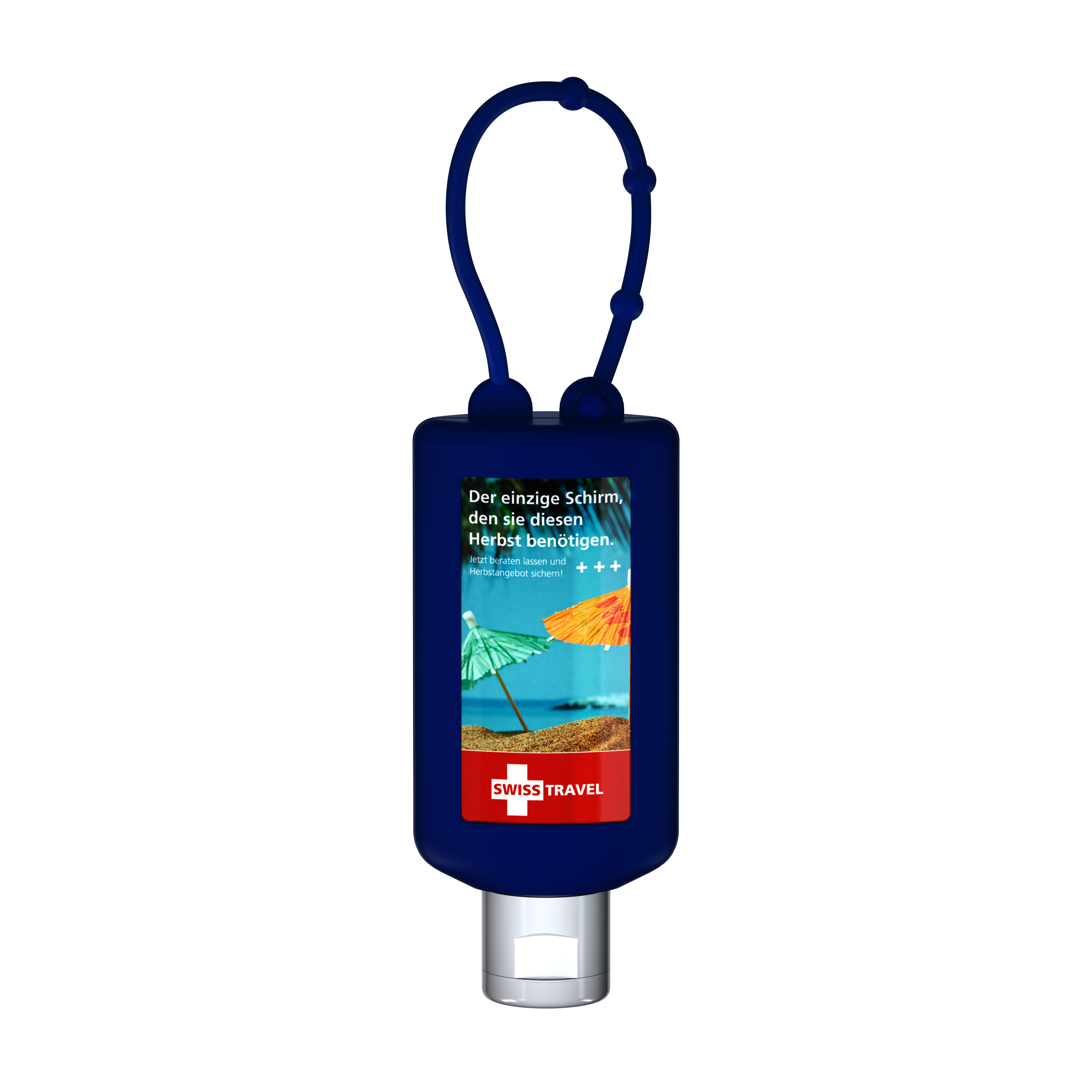 50 ml Flasche und Klappdeckel (zufällig ausgerichtet) weiß, Silikonhülle und Schlaufe in blau.