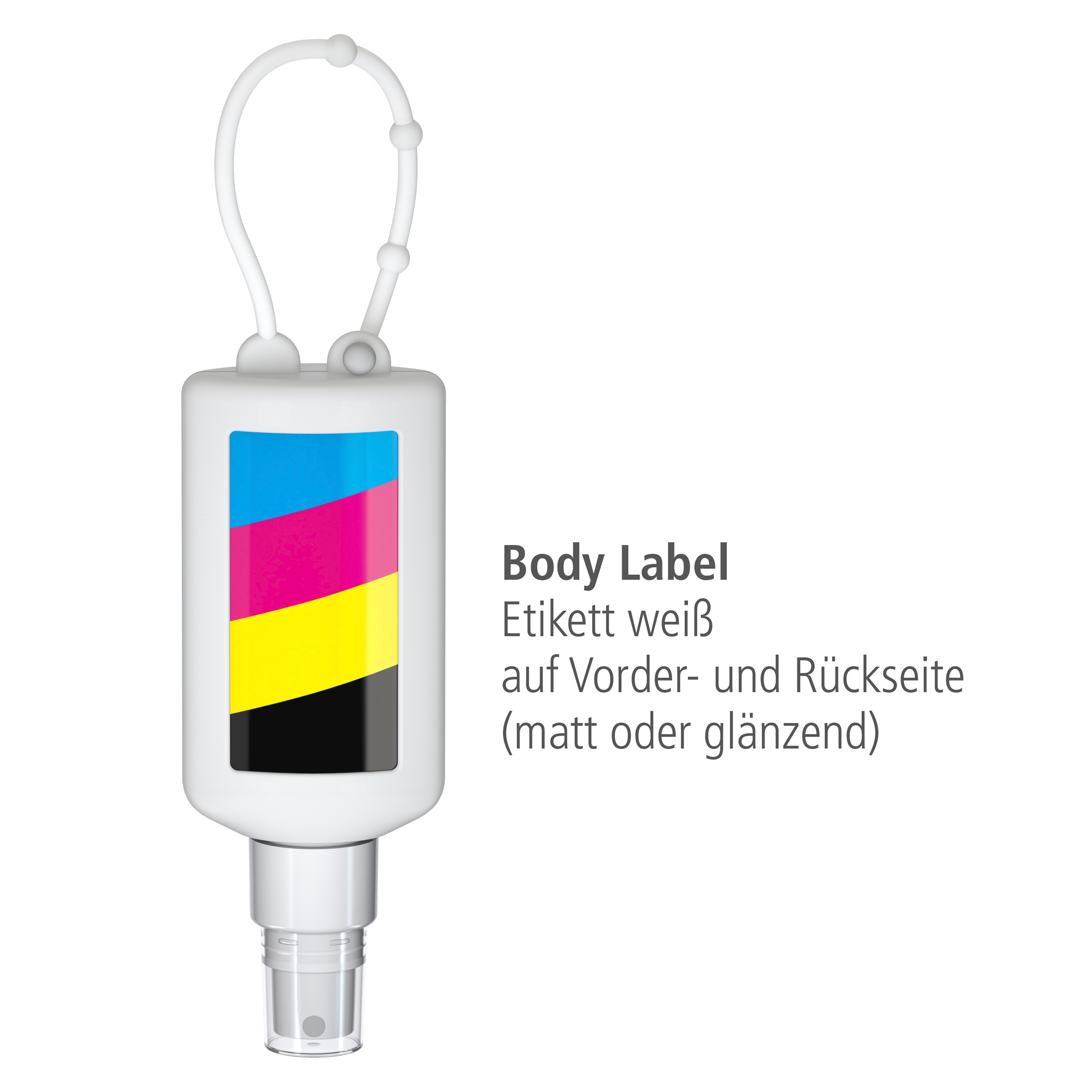 Dekoration: Body Label: Etikett PE (weiß), Druck 4c CMYK. Wahlweise glänzend oder matt.