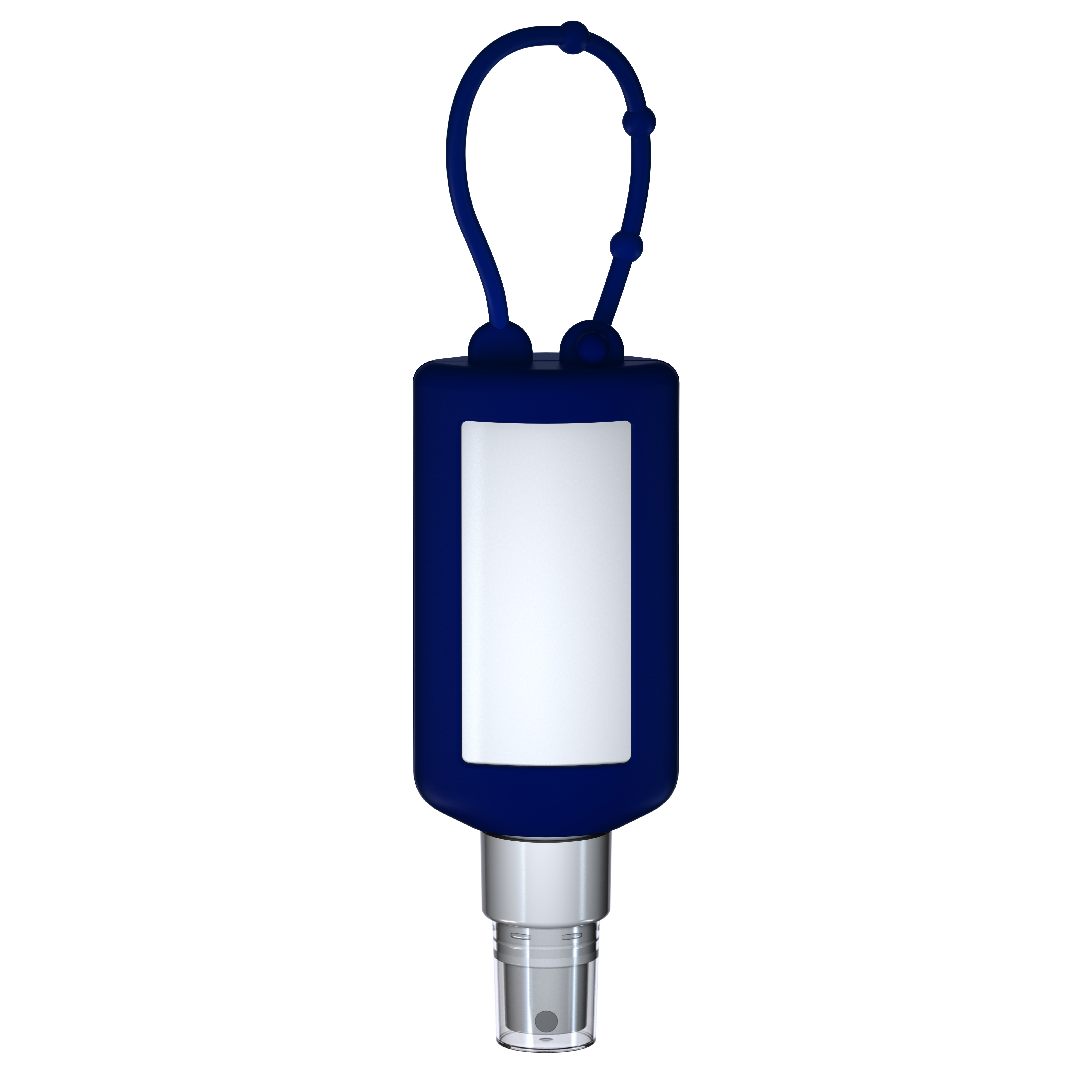 50 ml PET Flasche (weiß) mit weißem Pumpaufsatz und transparenter Schutzkappe, Silikonhülle und Schlauf in blau.