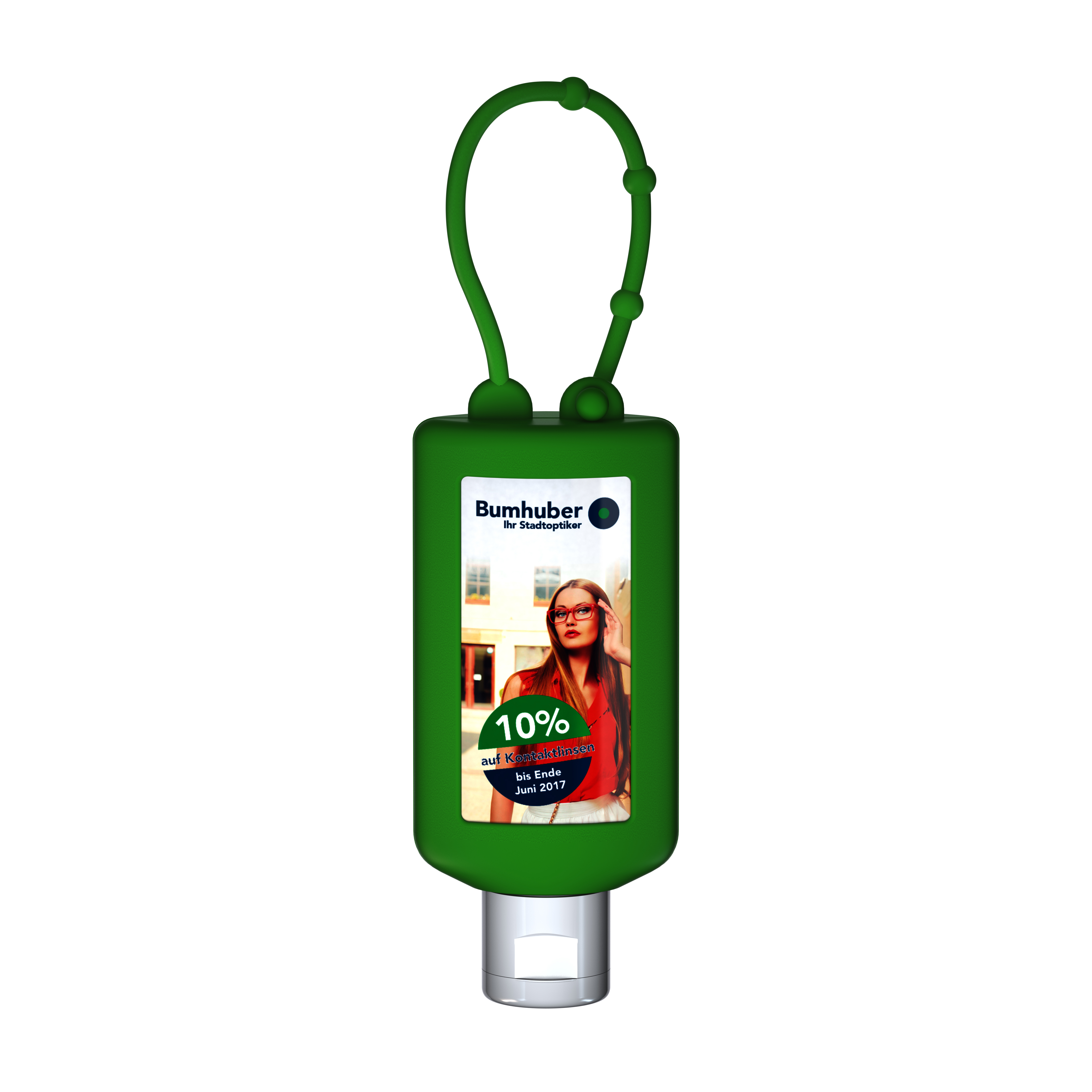 50 ml Flasche und Klappdeckel (zufällig ausgerichtet) weiß, Silikonhülle und Schlaufe in grün.