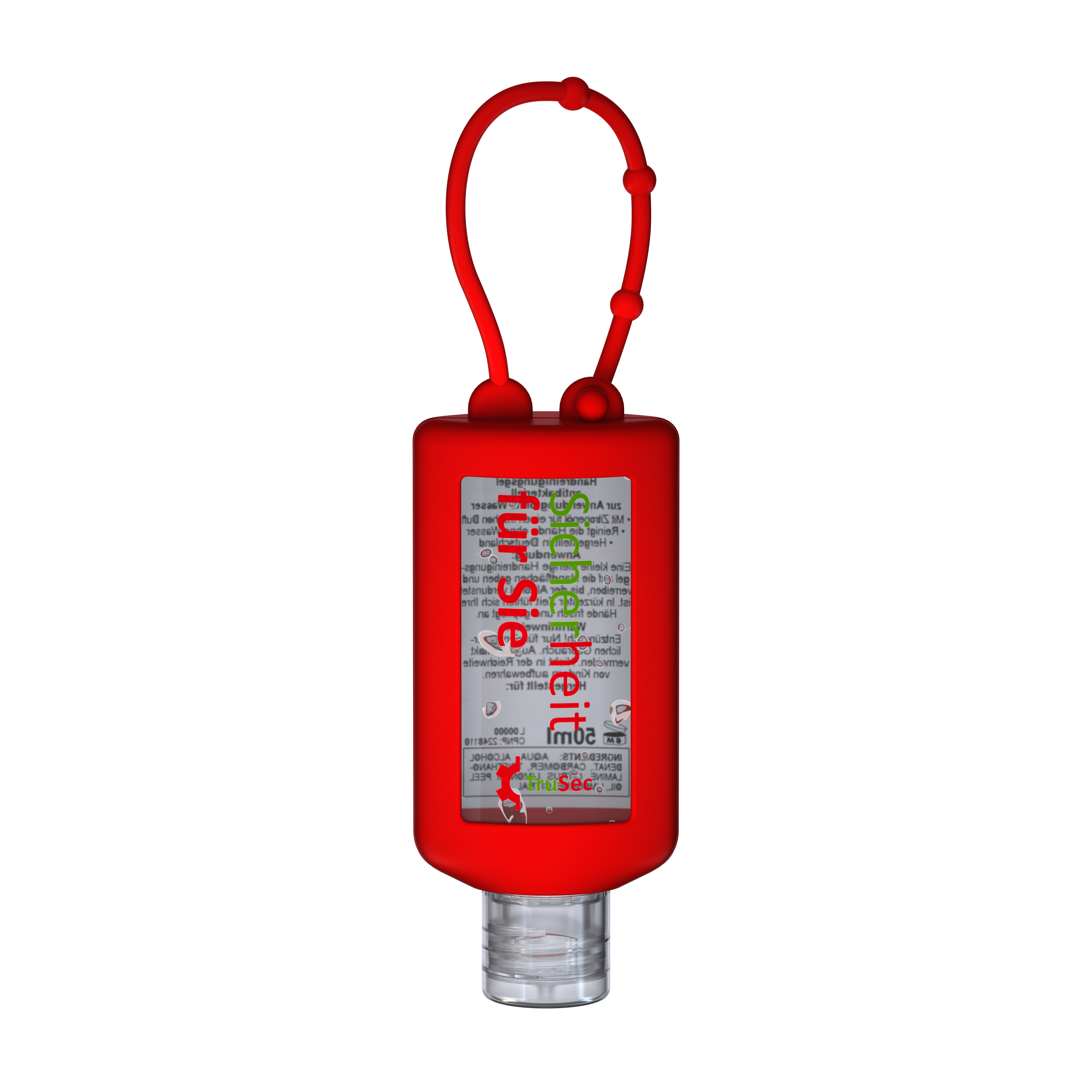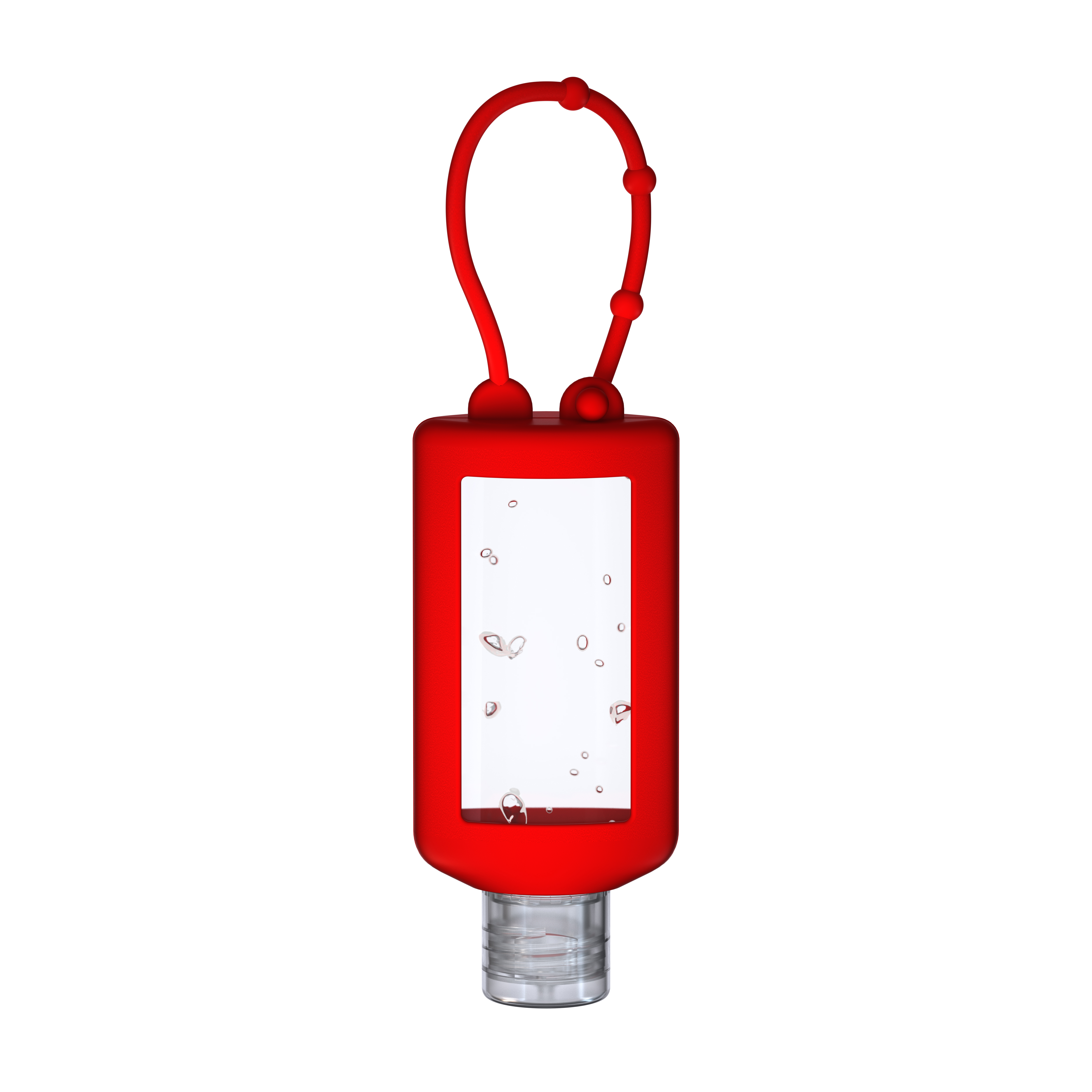 50 ml Flasche kristallklar, Klappdeckel (zufällig ausgerichtet) natur-transparent, Silikonhülle und Schlaufe in rot.