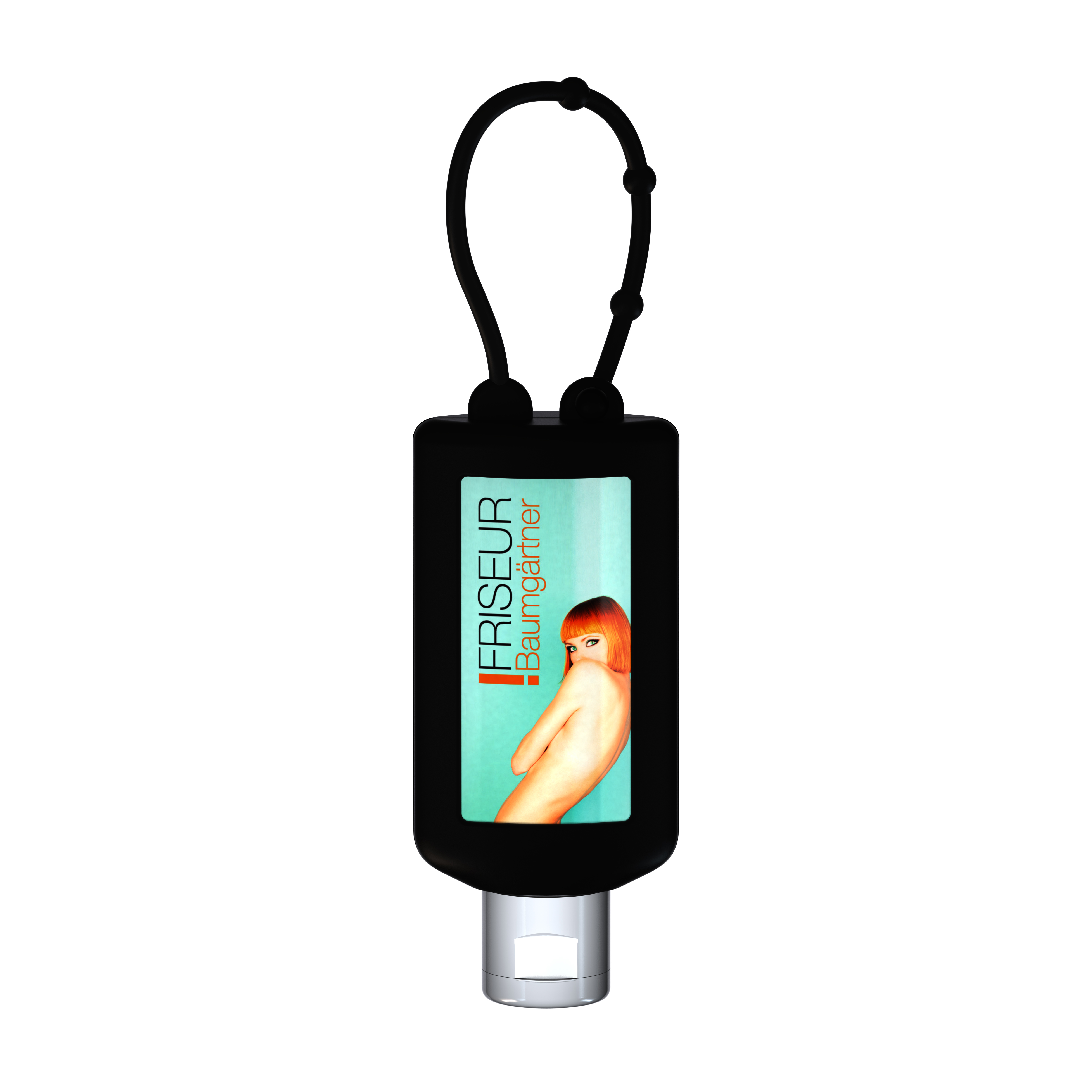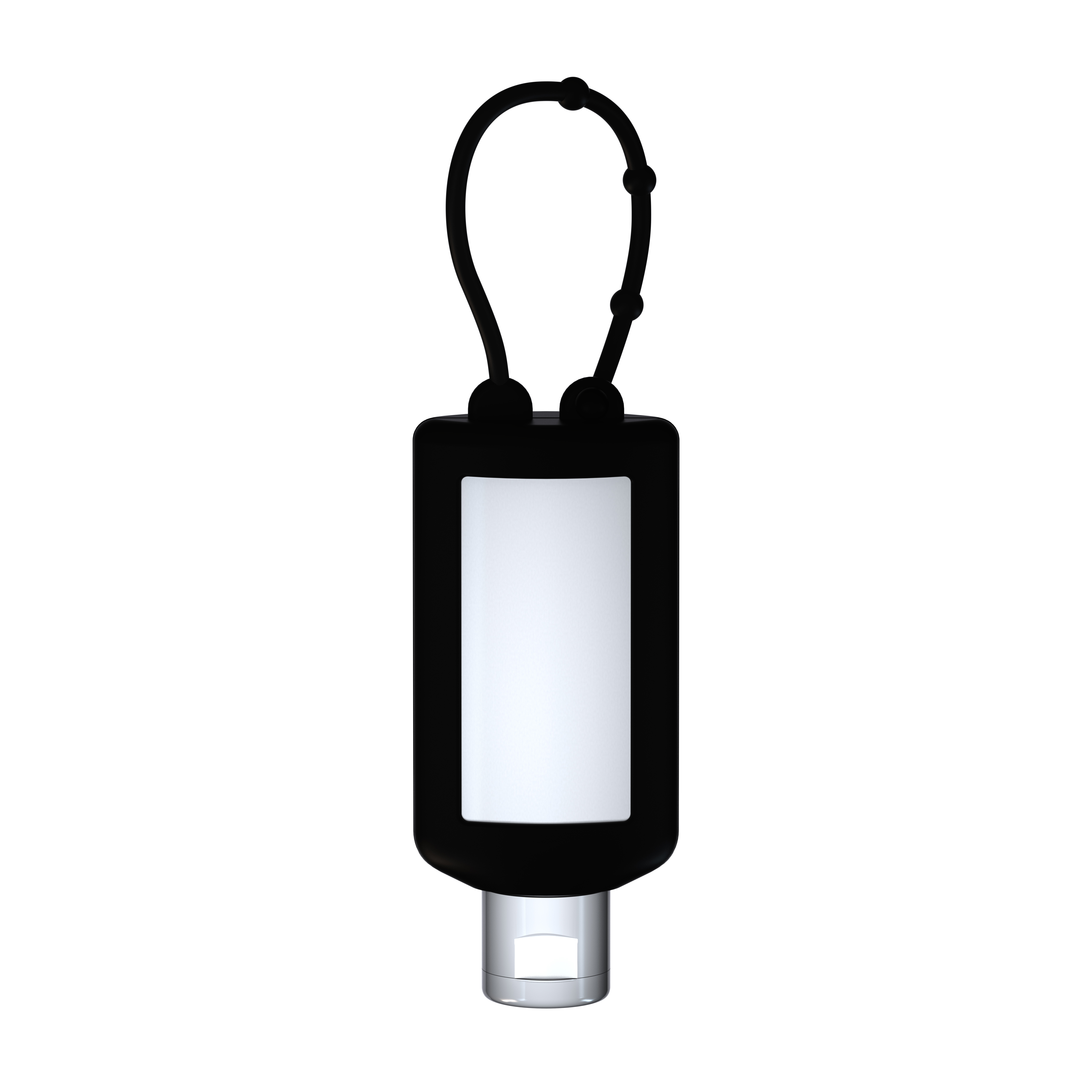 50 ml Flasche und Klappdeckel (zufällig ausgerichtet) weiß, Silikonhülle und Schlaufe in schwarz.