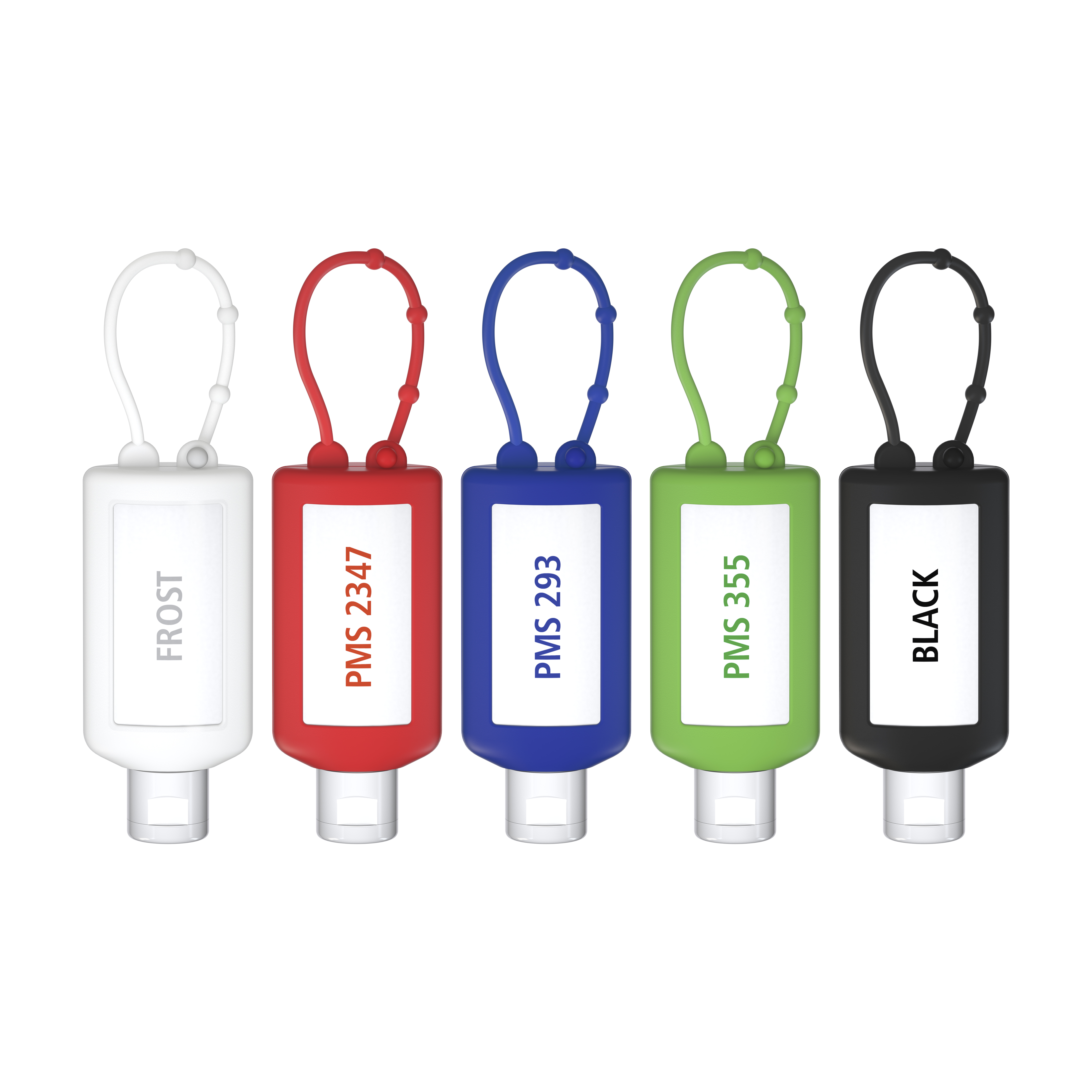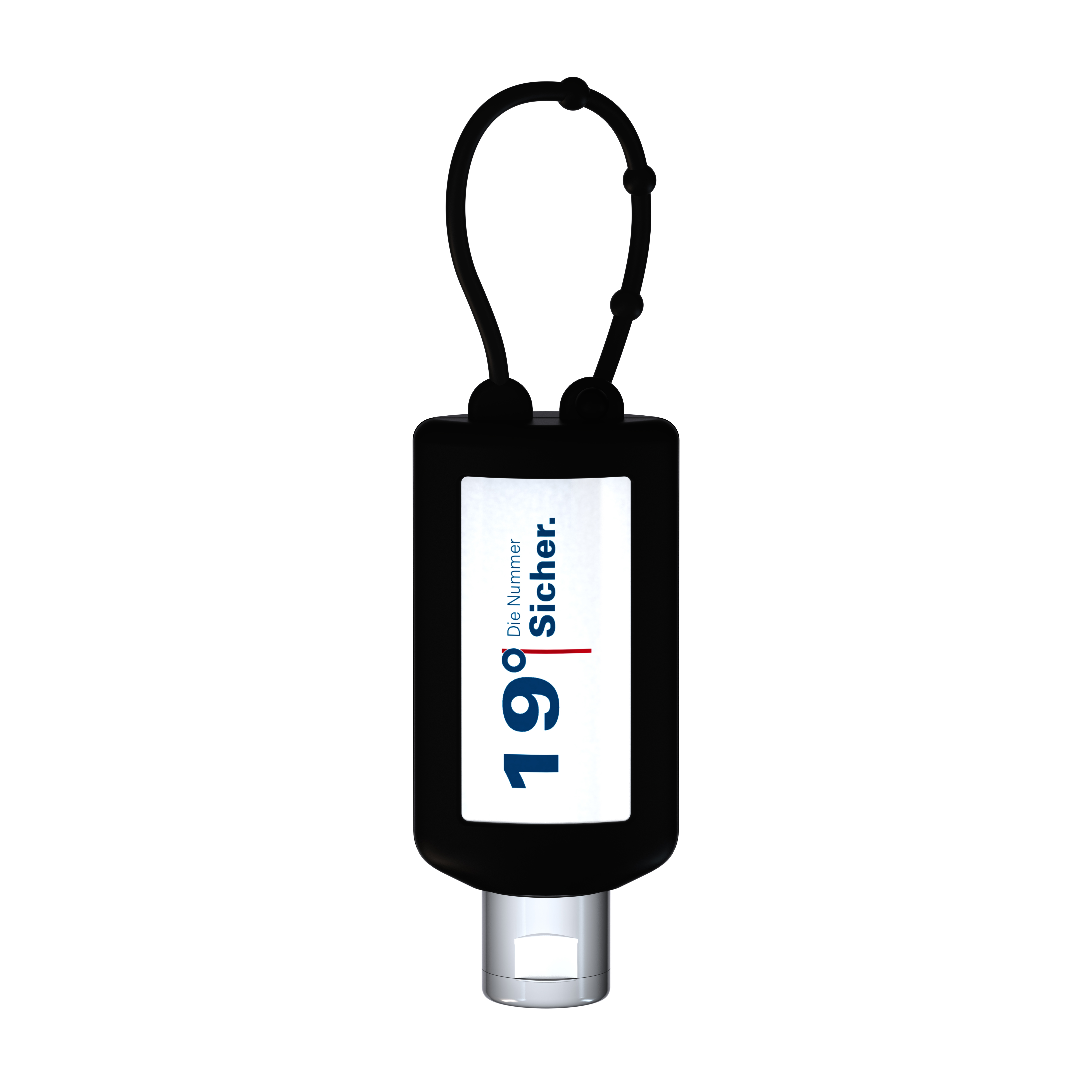 50 ml Flasche und Klappdeckel (zufällig ausgerichtet) weiß, Silikonhülle und Schlaufe in schwarz.