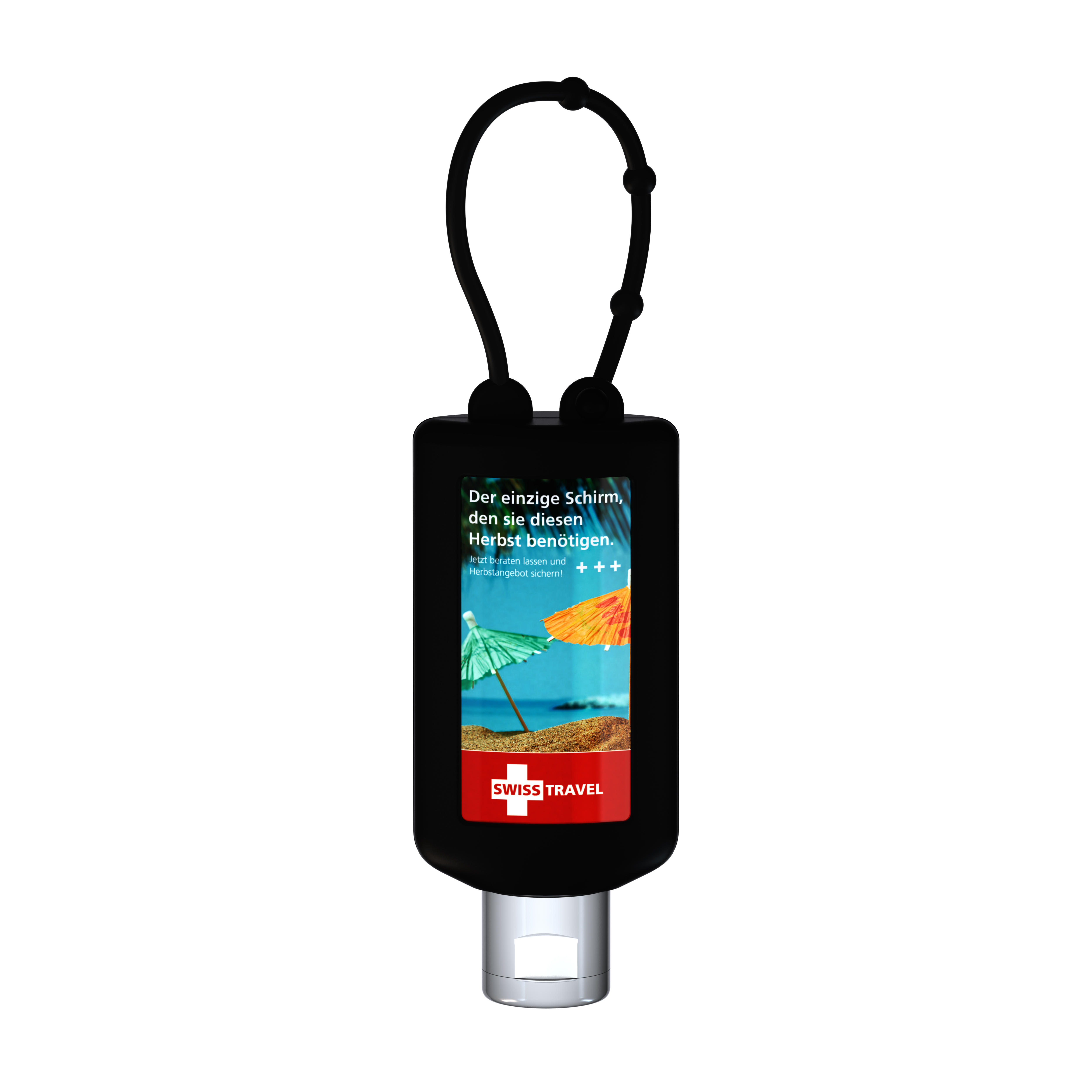 50 ml Flasche und Klappdeckel (zufällig ausgerichtet) weiß, Silikonhülle und Schlaufe in schwarz.