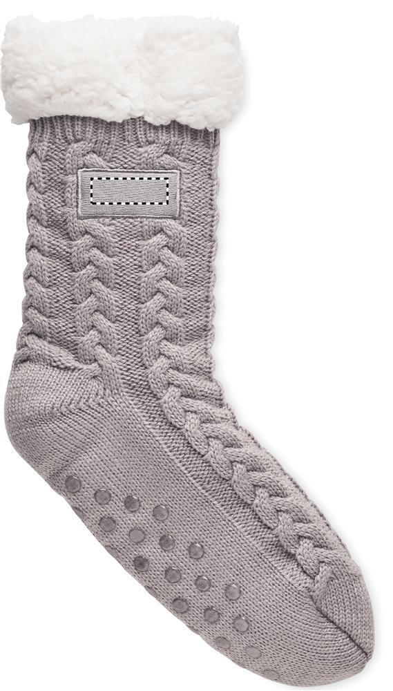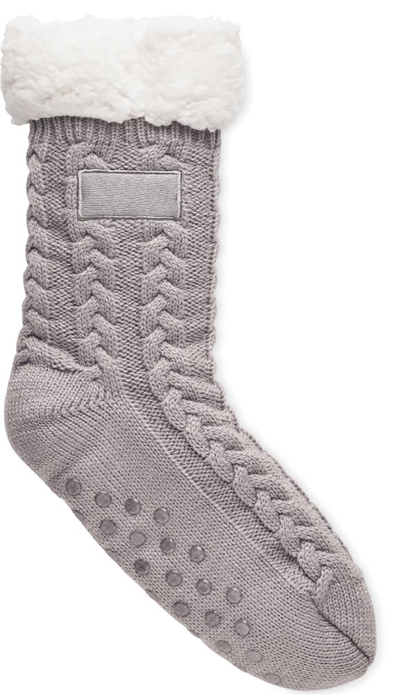 Socken mit Zopfstrickmuster und Anti-Rutsch-Sohle. Acrylgarn mit Sherpa- Futter 240 g/m². Lieferung in Hülse aus Papier. Größe L entspricht 40-43.