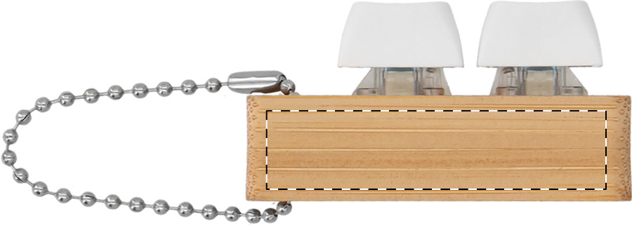 Schlüsselanhänger aus Bambus mit Metallkette und 2 Antistress-Knöpfen aus recyceltem ABS, die die Tasten einer mechanischen Tastatur imitieren.