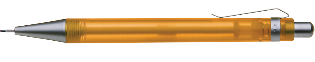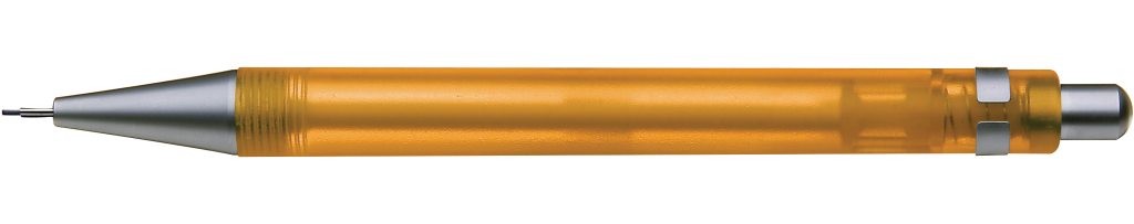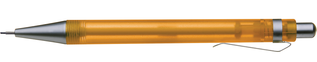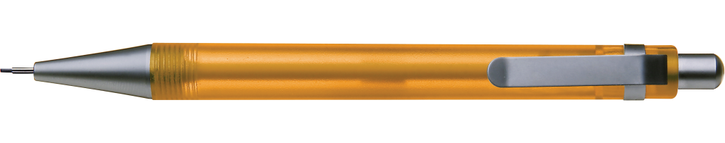 Druckbleistift (0,7mm) mit transparent gefrostetem oder gedecktem Gehäuse. Metalldrücker, Metallclip und Metallspitze matt verchromt.