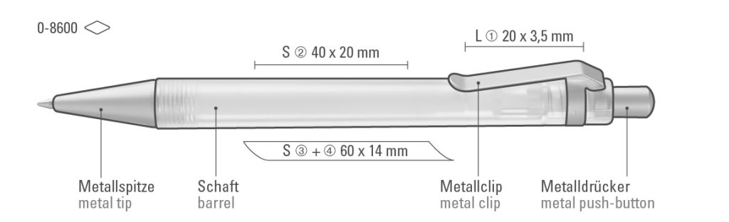 Druckkugelschreiber mit transparent gefrostetem oder gedecktem Gehäuse. Metalldrücker, Metallclip und Metallspitze matt verchromt.Druckbereich: In Clipverlängerung 40mm x 20mm Siebdruck (S), gegenüber vom Clip 60mm x 14mm Siebdruck (S), auf dem Clip 20mm x 3,5mm Lasergravur (L), seitlich vom Clip 60mm x 14mm Siebdruck (S), auf dem Clip 20mm x 3,5mm Einzelnamensgravur (EL)