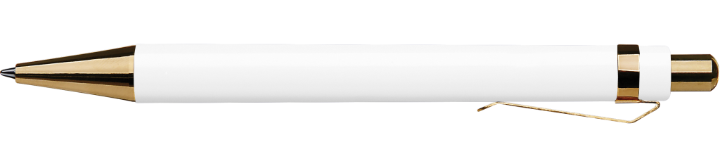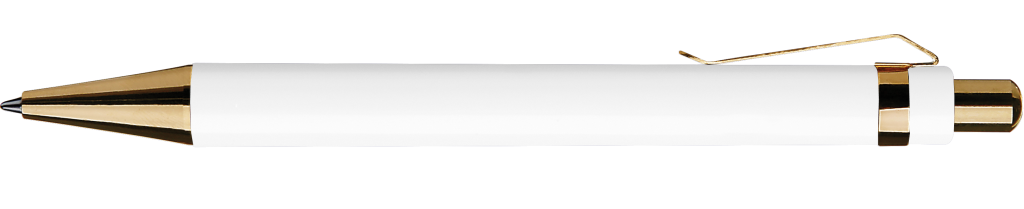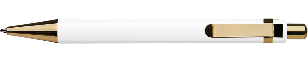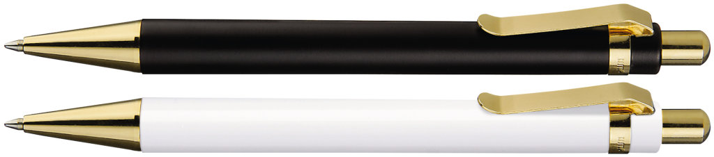 Druckkugelschreiber mit schwarzem oder weißem Gehäuse. Metalldrücker, Metallclip und Metallspitze gold glänzend.