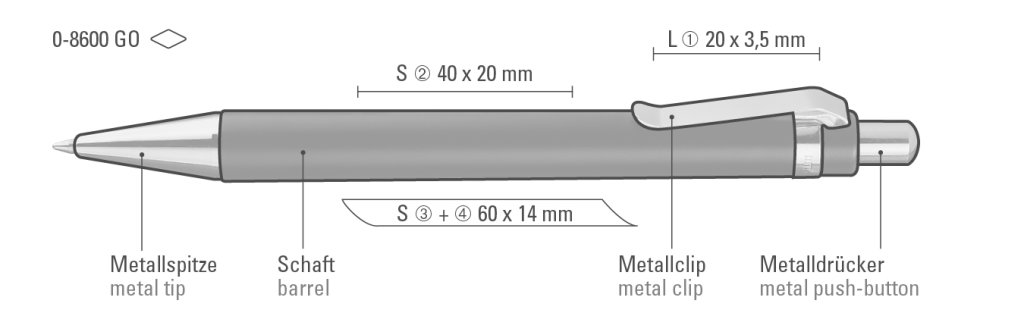 Druckbereich: In Clipverlängerung 40mm x 20mm Siebdruck (S), gegenüber vom Clip 60mm x 14mm Siebdruck (S), seitlich vom Clip 60mm x 14mm Siebdruck (S), auf dem Clip 20mm x 3,5mm Lasergravur (L), auf dem Clip 20mm x 3,5mm Einzelnamensgravur (EL), auf dem Clip 20mm x 3,5mm Ätzung (E)