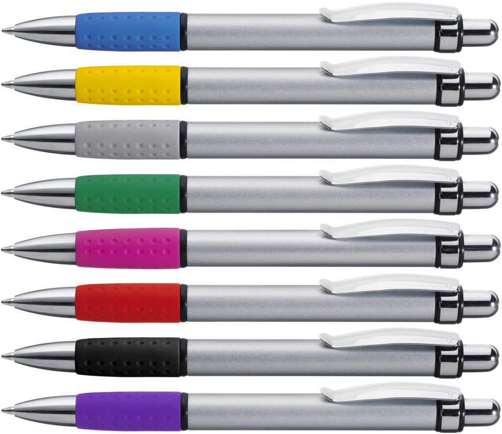 Metall-Druckkugelschreiber mit Aluminiumschaft, Metallclip und farbiger Gummigriffzone.Druckbereich: Auf dem Clip 25mm x 4mm Lasergravur (L), in Clipverlängerung 20mm x 20mm Siebdruck (MS), in Clipverlängerung 30mm x 6mm Lasergravur (L), gegenüber vom Clip 50mm x 13mm Siebdruck (MS), gegenüber vom Clip 60mm x 6mm Lasergravur (L), seitlich vom Clip 50mm x 13mm Siebdruck (MS), seitlich vom Clip 60mm x 6mm Lasergravur (L), auf dem Clip 25mm x 4mm Einzelnamensgravur (EL), in Clipverlängerung 30mm x 6mm Einzelnamensgravur (EL), gegenüber vom Clip 60mm x 6mm Einzelnamensgravur (EL), seitlich vom Clip 60mm x 6mm Einzelnamensgravur (EL)