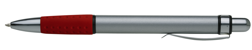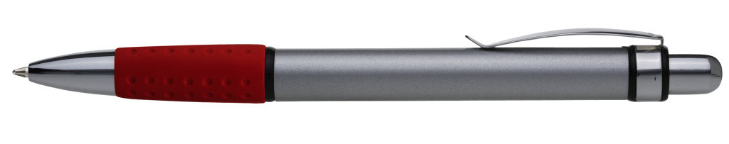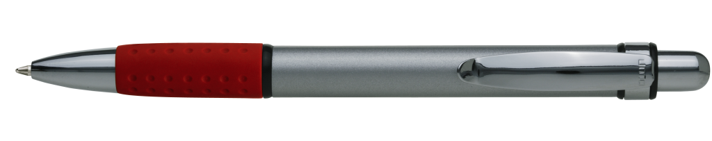 Metall-Druckkugelschreiber mit Aluminiumschaft, Metallclip und farbiger Gummigriffzone.