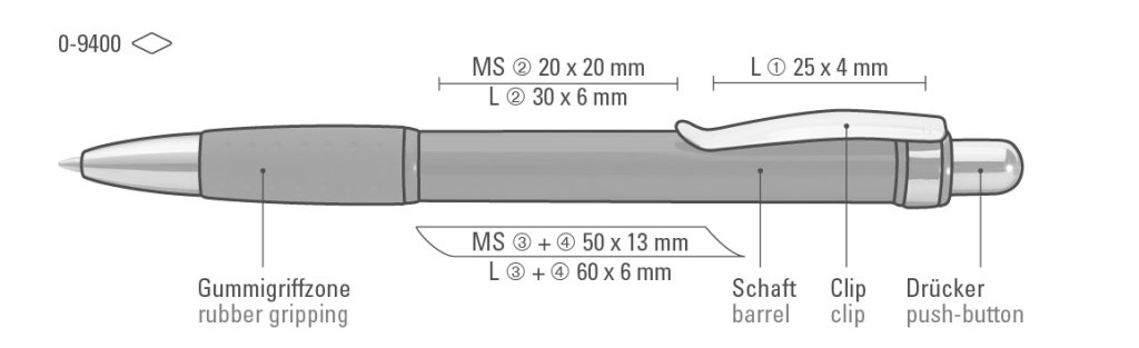 Druckbereich: Auf dem Clip 25mm x 4mm Lasergravur (L), in Clipverlängerung 20mm x 20mm Siebdruck (MS), in Clipverlängerung 30mm x 6mm Lasergravur (L), gegenüber vom Clip 50mm x 13mm Siebdruck (MS), gegenüber vom Clip 60mm x 6mm Lasergravur (L), seitlich vom Clip 50mm x 13mm Siebdruck (MS), seitlich vom Clip 60mm x 6mm Lasergravur (L), auf dem Clip 25mm x 4mm Einzelnamensgravur (EL), in Clipverlängerung 30mm x 6mm Einzelnamensgravur (EL), gegenüber vom Clip 60mm x 6mm Einzelnamensgravur (EL), seitlich vom Clip 60mm x 6mm Einzelnamensgravur (EL)