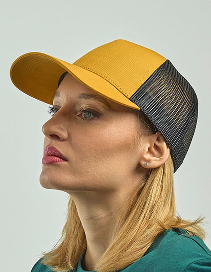 Fünf SegmentePVC-VerschlussMesh hintenMesh seitlichStrukturiertes FrontsegmentVorgebogener SchirmVier Ziernähte auf dem SchirmMaterial: 100% Baumwolle, Netz: 100% Polyester, Schweißband: 65% Polyester, 35% BaumwolleGewicht: 0.098Veredelung: Bestickung, Bedruckung, BeflockungGröße: One Size