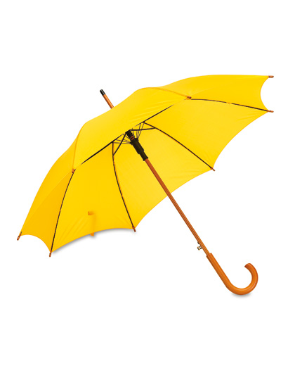190T NylonGebogene HolzkrückeMetallgestängeTips und Schaft aus HolzMaterial: Bezug: 100% NylonGewicht: 0.41Veredelung: Bestickung, Bedruckung, BeflockungGröße: Ø ca. 103 cm