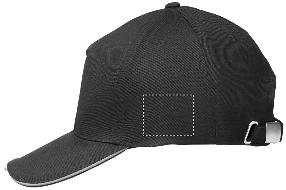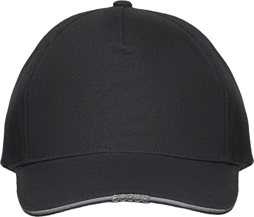 Baseball Kappe aus Baumwolle 220g/m². 5 Panels. 5 LED Leuchten im Kappenschirm. Schnalle aus Metall. Inkl. USB-Ladekabel.