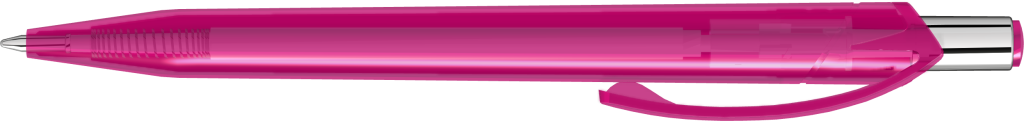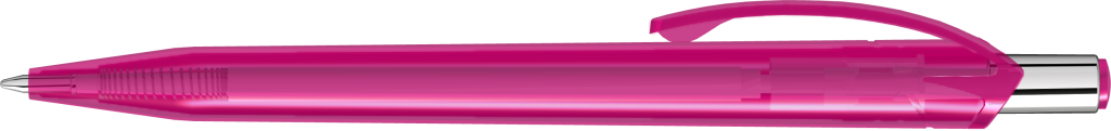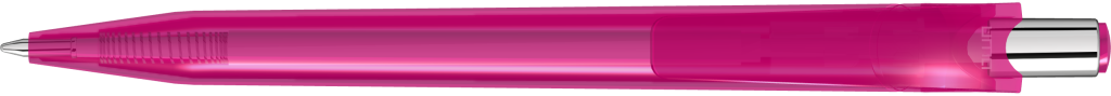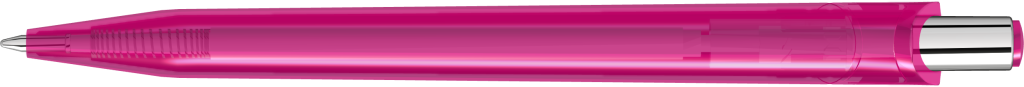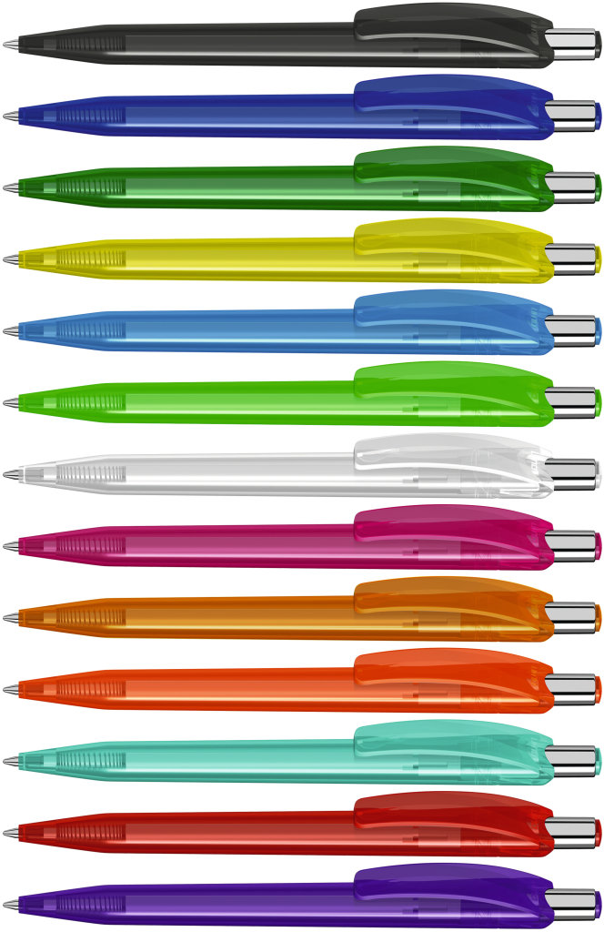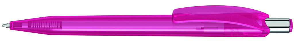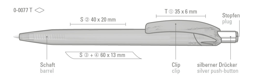 Druckkugelschreiber mit glänzend transparentem Gehäuse und Drückerstopfen. Drücker in silber glänzend.Druckbereich: In Clipverlängerung 40mm x 20mm Siebdruck (S), auf dem Clip 35mm x 6mm Tampondruck (T), seitlich vom Clip 60mm x 13mm Siebdruck (S), gegenüber vom Clip 60mm x 13mm Siebdruck (S)