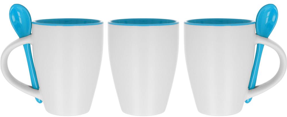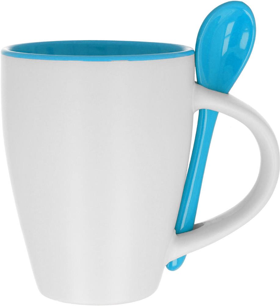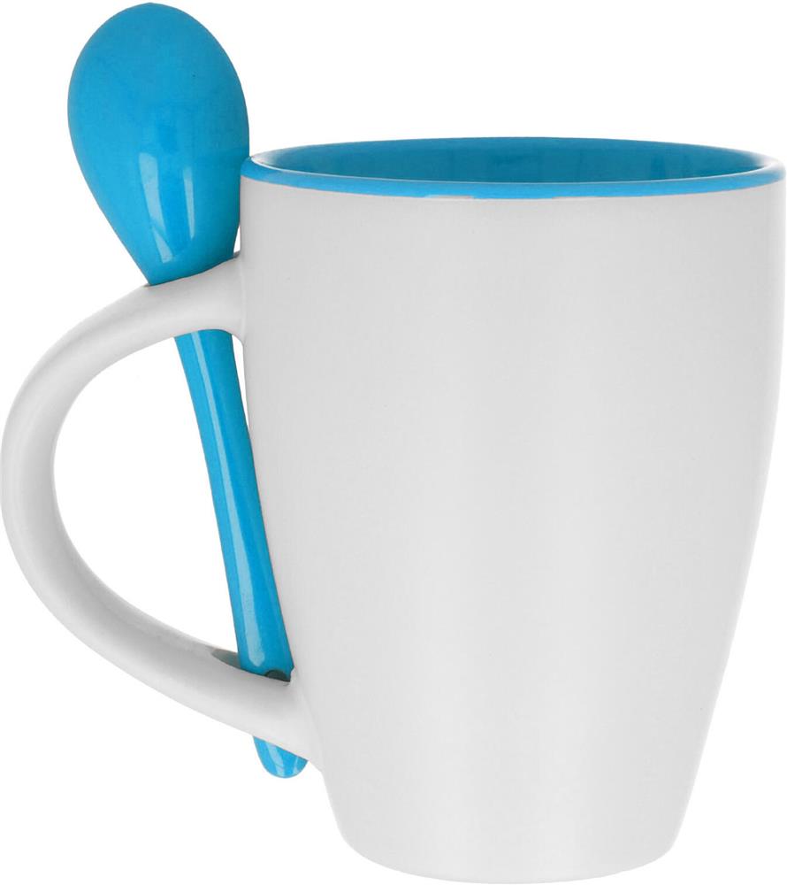 Zweifarbiger Kaffeebecher aus Keramik mit Löffel. Füllmenge: 250 ml. Nur Keramik-Transferdruck ist spülmaschinengeeignet. Verpackt in einem Karton.