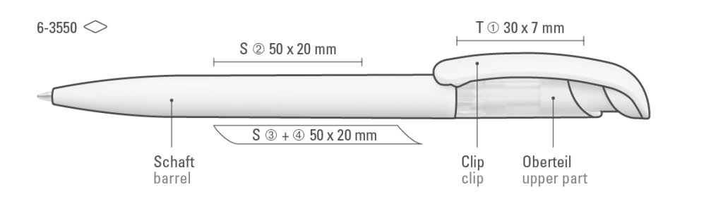 Druckbereich: Auf dem Clip 30mm x 7mm Tampondruck (T), in Clipverlängerung 50mm x 20mm Siebdruck (S), seitlich vom Clip 50mm x 20mm Siebdruck (S), gegenüber vom Clip 50mm x 20mm Siebdruck (S)