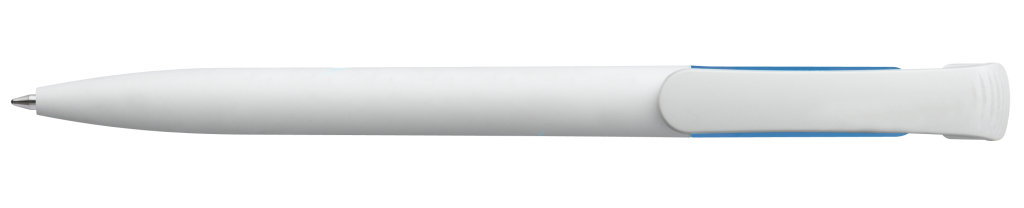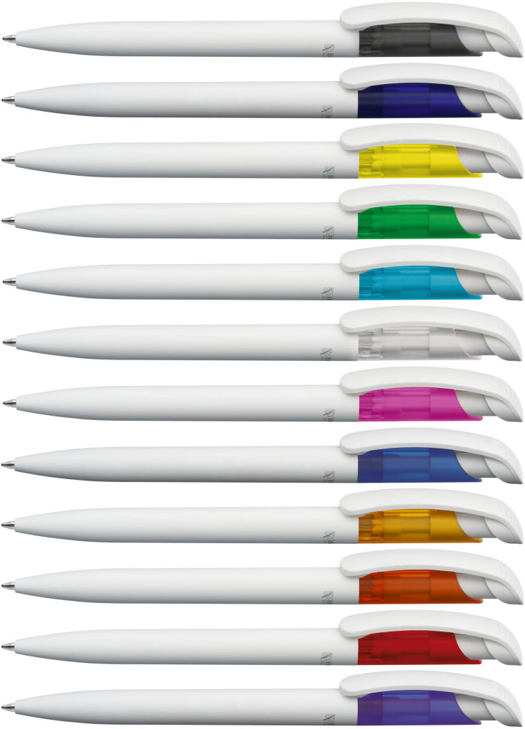 Weißer Kunststoff-Kugelschreiber mit farbigem Clip, blauschreibend.Maße: ø10×138 mmSchreibgerät-Typ: KugelschreiberSchreibgerät-Mechanik: DruckmechanikSchreibfarbe: BlauMinentyp: Normale MineLinienstärke: 1 mmMaterial: Kunststoff (ABS)Veredelungsposition 1: Korpus - rechts vom ClipTechnologie: UV-LED-Druck - EinzelnamenDurchmesser: 0Druckcode: NUVATechnologie: TampondruckMaximale Farben: 4Durchmesser: 0Druckcode: P0Technologie: TampondruckMaximale Farben: 1Durchmesser: 0Druckcode: P1Technologie: UV LED DruckDurchmesser: 0Druckcode: UVAVeredelungsposition 2: Korpus - links vom ClipTechnologie: UV-LED-Druck - EinzelnamenDurchmesser: 0Druckcode: NUVATechnologie: TampondruckMaximale Farben: 4Durchmesser: 0Druckcode: P0Technologie: TampondruckMaximale Farben: 1Durchmesser: 0Druckcode: P1Technologie: UV LED DruckDurchmesser: 0Druckcode: UVAVeredelungsposition 3: KlipTechnologie: TampondruckMaximale Farben: 4Durchmesser: 0Druckcode: P0Veredelungsposition 4: Korpus - in Verlängerung vom ClipTechnologie: TampondruckMaximale Farben: 4Durchmesser: 0Druckcode: P0