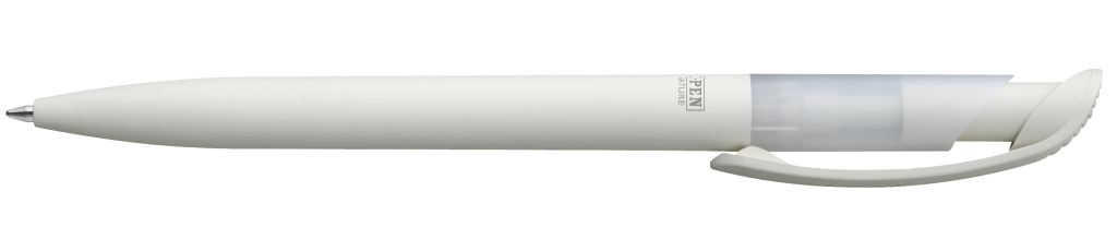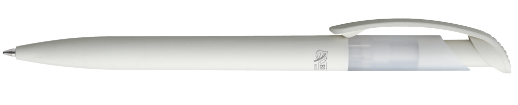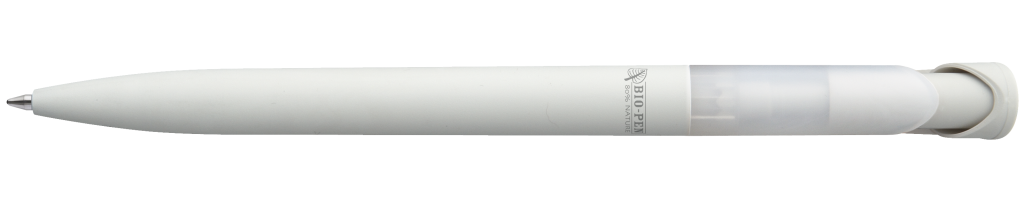 Druckkugelschreiber mit Gehäuse und Clip aus 100% nachwachsendem und kompostierbarem Material. Oberteil aus gefrostetem ABS Kunststoff.Druckbereich: Auf dem Clip 30mm x 7mm Tampondruck (T), in Clipverlängerung 50mm x 20mm Siebdruck (S), seitlich vom Clip 50mm x 20mm Siebdruck (S), gegenüber vom Clip 50mm x 20mm Siebdruck (S)