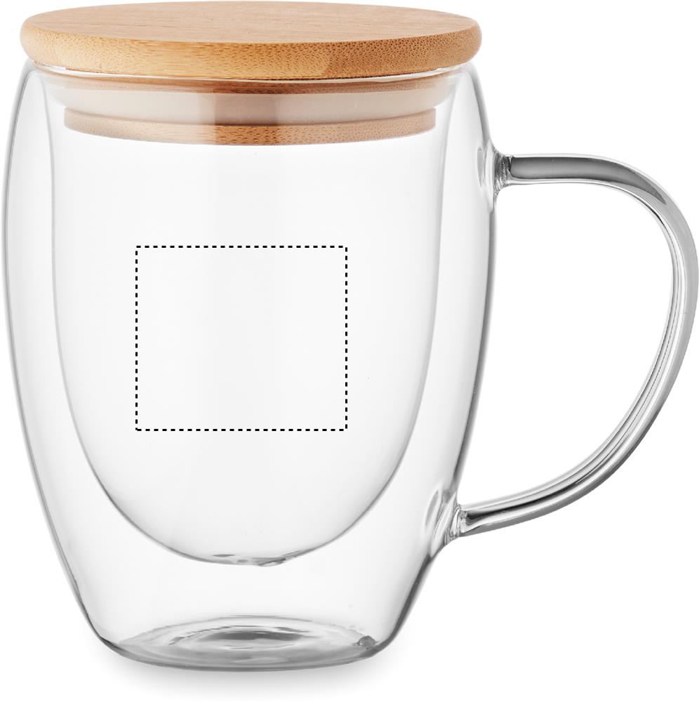 Doppelwandiges Borosilikatglas mit Henkel. Deckel aus Bambus. Füllmenge: 250 ml.