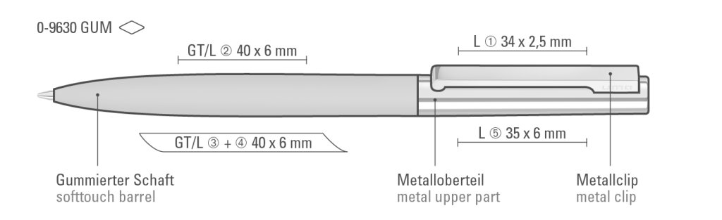 Metall-Drehkugelschreiber mit Softtouch-Schaft, glanzverchromtem Metalloberteil und gefederter Metallclip.Druckbereich: Auf dem Clip 34mm x 2,5mm Lasergravur (L), in Clipverlängerung 40mm x 6mm Lasergravur (L), gegenüber vom Clip 40mm x 6mm Lasergravur (L), seitlich vom Clip 40mm x 6mm Lasergravur (L), in Clipverlängerung 40mm x 6mm Siebdruck (GS), gegenüber vom Clip 40mm x 6mm Siebdruck (GS), seitlich vom Clip 40mm x 6mm Siebdruck (GS), auf der Kappe/auf dem Oberteil 35mm x 6mm Lasergravur (L), auf dem Clip 34mm x 2,5mm Einzelnamensgravur (EL), in Clipverlängerung 40mm x 6mm Einzelnamensgravur (EL), gegenüber vom Clip 40mm x 6mm Einzelnamensgravur (EL), seitlich vom Clip 40mm x 6mm Einzelnamensgravur (EL), auf der Kappe/auf dem Oberteil 35mm x 6mm Einzelnamensgravur (EL)