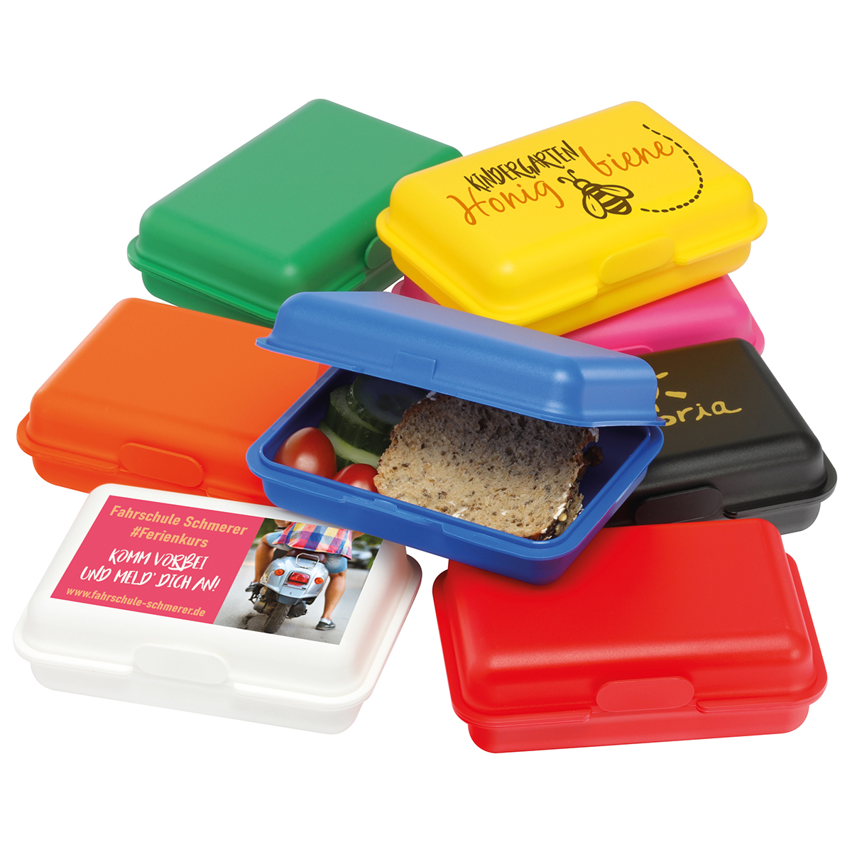 Die ideale Box für das Pausenbrot – mit Klickverschluss sicher verschließbar. In vielen Farben erhältlich und optimal für die Veredelung per IMould-Verfahren geeignet.Material: KunststoffMaße: 125 x 85 x 40 x Ø: 0,00 mmGewicht: 65 gDruckmöglichkeitenPosition 1: Oben mittigDruckart: SiebdruckDruckgruppe: DBMaximale Farben: 5Breite: 100 mmHöhe: 57 mmPosition 2: Unten mittigDruckart: SiebdruckDruckgruppe: DBMaximale Farben: 5Breite: 70 mmHöhe: 60 mm