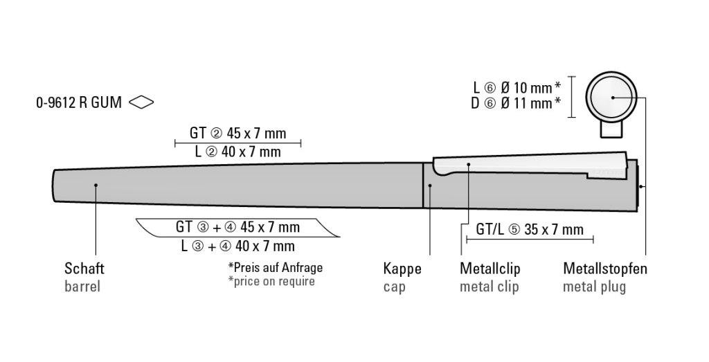 Druckbereich: In Clipverlängerung 40mm x 7mm Lasergravur (L), gegenüber vom Clip 40mm x 7mm Lasergravur (L), seitlich vom Clip 40mm x 7mm Lasergravur (L), in Clipverlängerung 45mm x 7mm Tampondruck (GT), gegenüber vom Clip 45mm x 7mm Tampondruck (GT), seitlich vom Clip 45mm x 7mm Tampondruck (GT), auf der Kappe/auf dem Oberteil 35mm x 7mm Tampondruck (GT), auf der Kappe/auf dem Oberteil 35mm x 7mm Lasergravur (L), auf dem Stopfen 10mm x 10mm Lasergravur (L), auf dem Stopfen 11mm x 11mm Doming (D), in Clipverlängerung 40mm x 7mm Einzelnamensgravur (EL), gegenüber vom Clip 40mm x 7mm Einzelnamensgravur (EL), seitlich vom Clip 40mm x 7mm Einzelnamensgravur (EL), auf der Kappe/auf dem Oberteil 35mm x 7mm Einzelnamensgravur (EL), auf dem Stopfen 10mm x 10mm Einzelnamensgravur (EL)