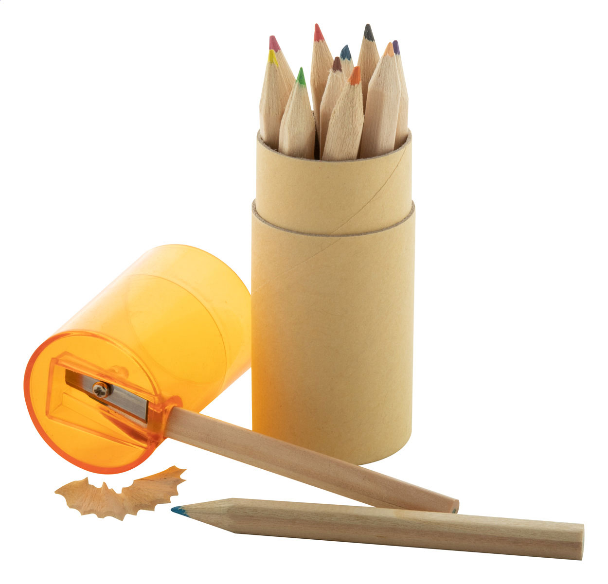 12 Buntstifte mit Anspitzer in rundem Papp-Etui.