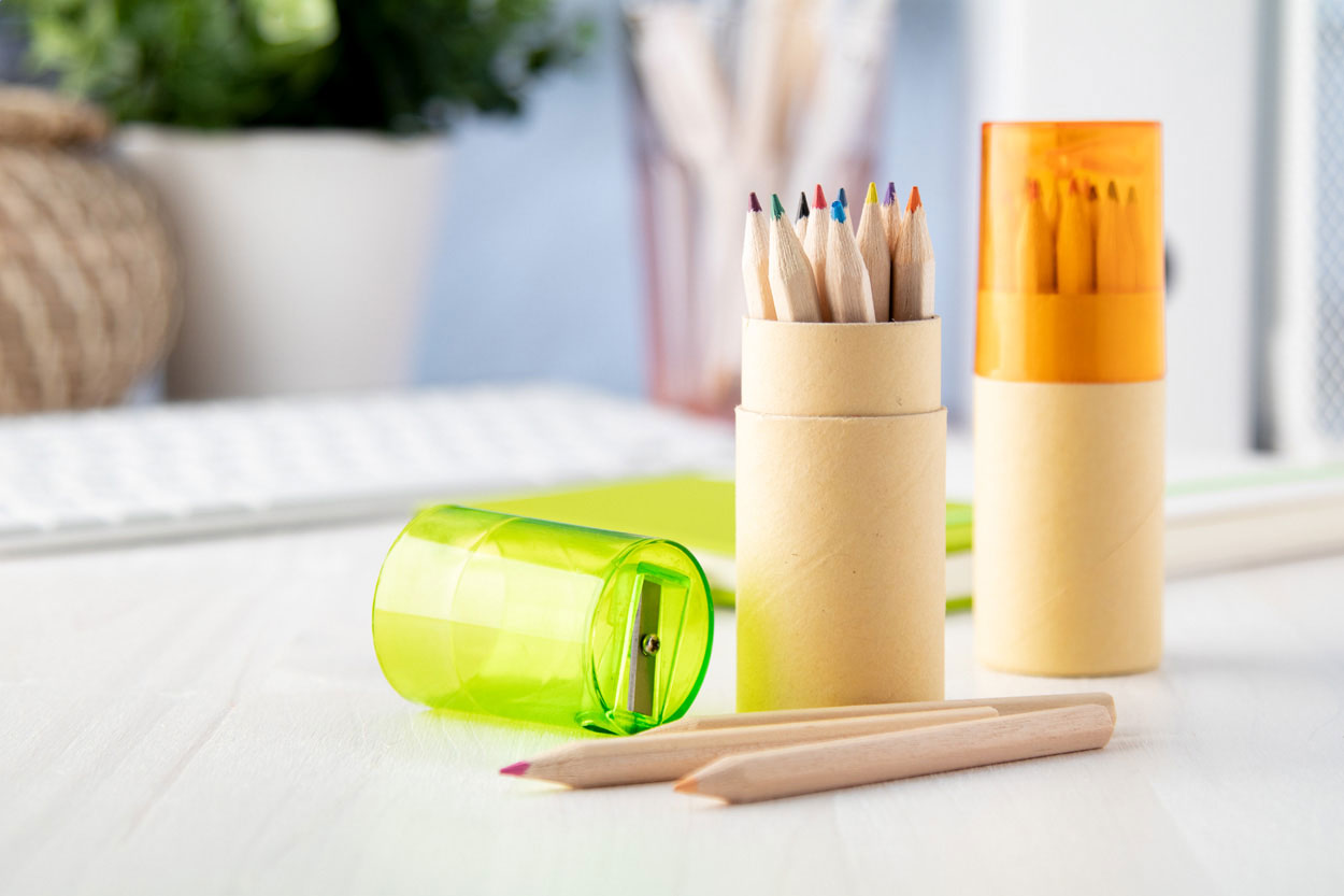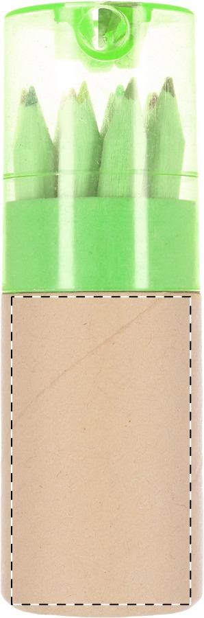 6 Buntstifte in einer Schachtel aus recyceltem Papier.Material: HolzMaße: 9x4,5x0,8 cmGewicht: 0.016 kgFarbe: MulticolourVeredelung: Bestickung, Bedruckung, BeflockungHandling/Farbcodes: /99Druckposition: FRONT PDDruckmaße: 46 x 55 mmDrucktechniken: PD1Druckposition: FRONT DOWNDruckmaße: 30 x 35 mmDrucktechniken: DL, P2Druckposition: FRONT TOPDruckmaße: 35 x 15 mmDrucktechniken: DL, P2Druckposition: BACKDruckmaße: 30 x 70 mmDrucktechniken: DL, P2Druckposition: BACK PDDruckmaße: 46 x 92 mmDrucktechniken: PD1