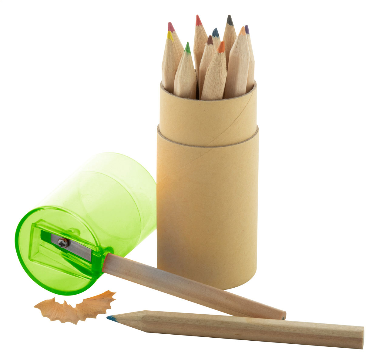 12 Buntstifte mit Anspitzer in rundem Papp-Etui.