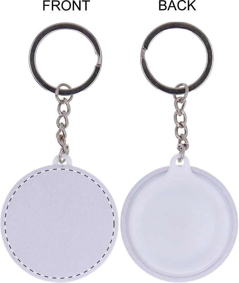 Kleiner Pin-Button-Schlüsselanhänger mit vollfarbigem RPET-Mikrofaserbezug. Preis inklusive Sublimationsdruck. MOQ: 100 Stück.