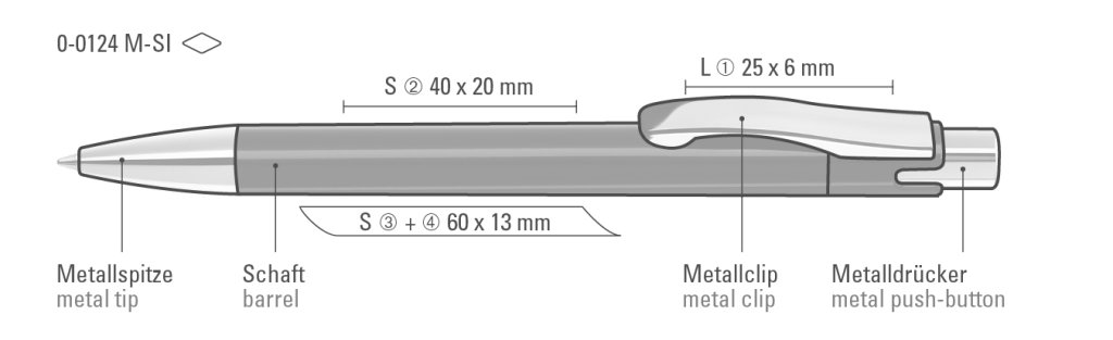 Druckkugelschreiber mit silber glänzendem Gehäuse, schwerer Metallspitze, Metalldrücker und Metallclip glanzverchromt.Druckbereich: Auf dem Clip 25mm x 6mm Lasergravur (L), in Clipverlängerung 40mm x 20mm Siebdruck (S), gegenüber vom Clip 60mm x 13mm Siebdruck (S), seitlich vom Clip 60mm x 13mm Siebdruck (S), auf dem Clip 25mm x 6mm Einzelnamensgravur (EL)