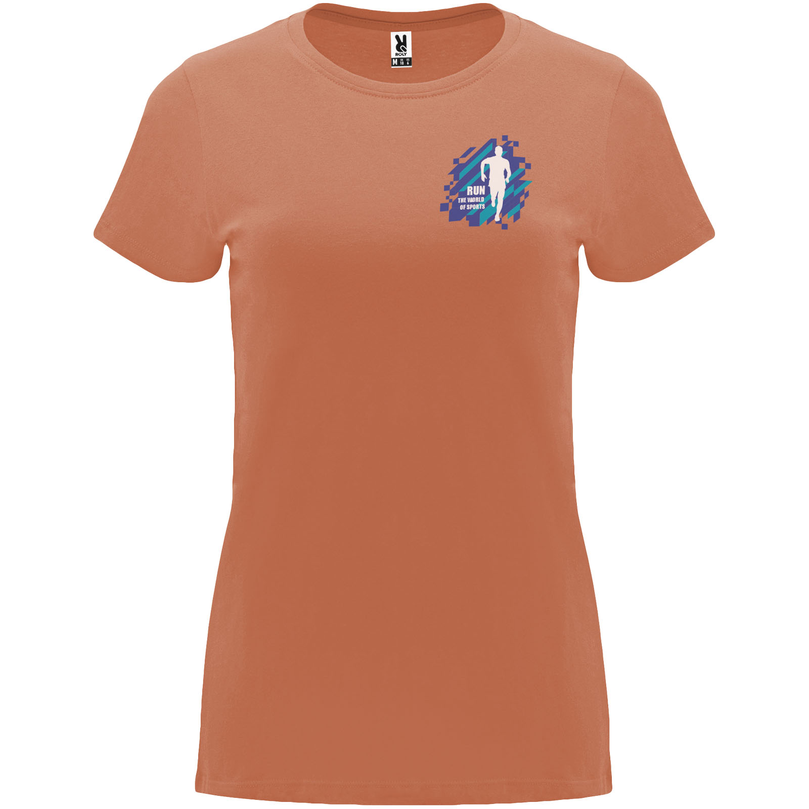 Tailliertes kurzärmeliges T-Shirt für Damen. Rundhalsausschnitt mit 1×1 Rippstrick. Verstärkte und verdeckte Nähte am Kragen. Herausnehmbares Etikett.