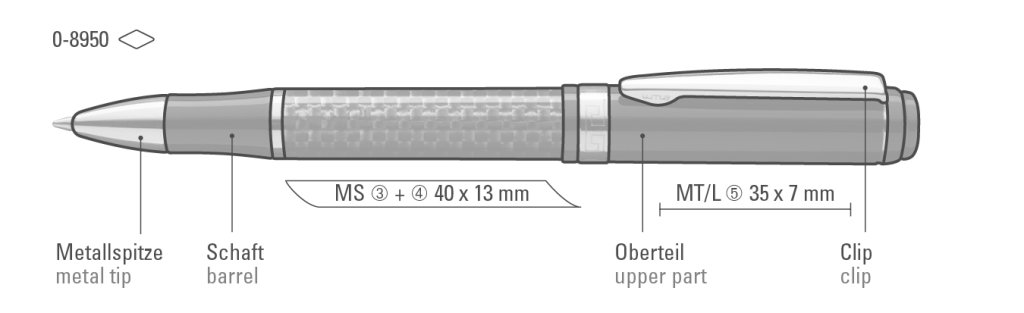 Druckbereich: Gegenüber vom Clip 40mm x 13mm Siebdruck (MS), seitlich vom Clip 40mm x 13mm Siebdruck (MS), auf der Kappe/auf dem Oberteil 35mm x 7mm Tampondruck (MT), auf der Kappe/auf dem Oberteil 35mm x 7mm Lasergravur (L), auf der Kappe/auf dem Oberteil 35mm x 7mm Einzelnamensgravur (EL)