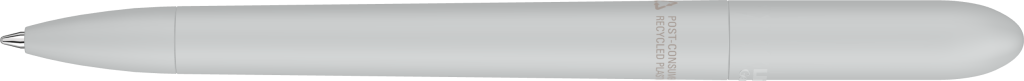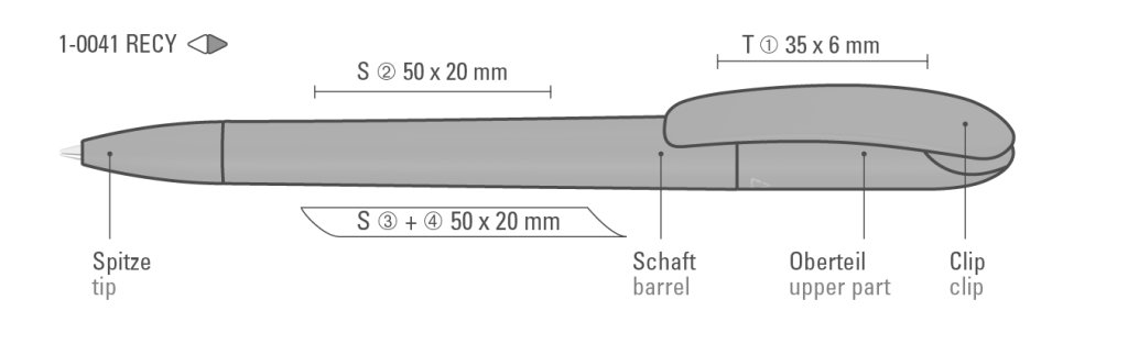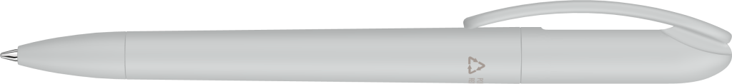 Drehkugelschreiber mit gedeckt mattem Gehäuse aus 100% recyceltem Post-Consumer-Kunststoff. Das Modell ist mit dem Recyclingzeichen gekennzeichnet. Aufgrund der Besonderheit des Materials (Post-Consumer Recycled Plastic) sind produktionstechnische Farbschwankungen gegeben.Druckbereich: Auf dem Clip 35mm x 6mm Tampondruck (T), in Clipverlängerung 40mm x 20mm Siebdruck (S), gegenüber vom Clip 40mm x 20mm Siebdruck (S), seitlich vom Clip 40mm x 20mm Siebdruck (S)