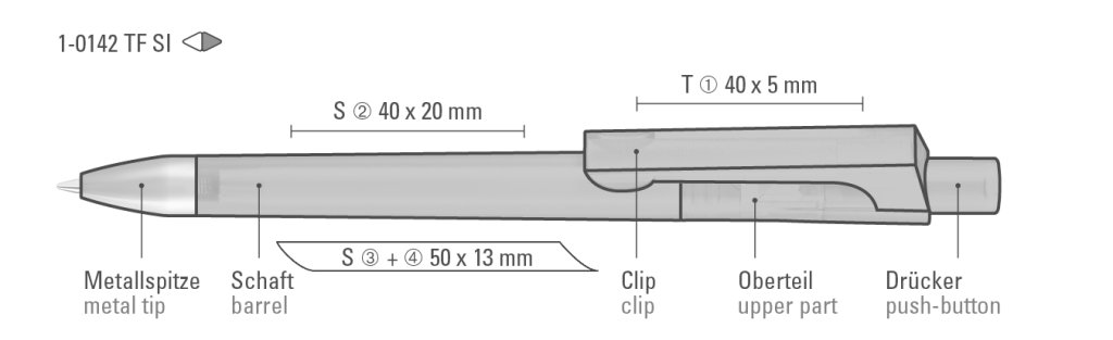 Druckbereich: In Clipverlängerung 40mm x 20mm Siebdruck (S), seitlich vom Clip 50mm x 13mm Siebdruck (S), gegenüber vom Clip 50mm x 13mm Siebdruck (S), auf dem Clip 40mm x 5mm Tampondruck (T)