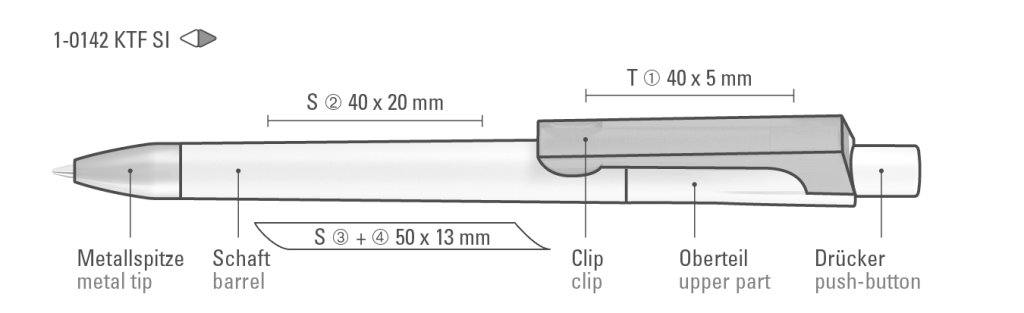 Druckbereich: In Clipverlängerung 40mm x 20mm Siebdruck (S), seitlich vom Clip 50mm x 13mm Siebdruck (S), gegenüber vom Clip 50mm x 13mm Siebdruck (S), auf dem Clip 40mm x 5mm Tampondruck (T)