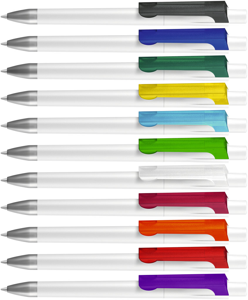 Weißer Kunststoff-Kugelschreiber mit farbigem Clip, blauschreibend.Maße: ø10×138 mmSchreibgerät-Typ: KugelschreiberSchreibgerät-Mechanik: DruckmechanikSchreibfarbe: BlauMinentyp: Normale MineLinienstärke: 1 mmMaterial: Kunststoff (ABS)Veredelungsposition 1: Korpus - rechts vom ClipTechnologie: UV-LED-Druck - EinzelnamenDurchmesser: 0Druckcode: NUVATechnologie: TampondruckMaximale Farben: 4Durchmesser: 0Druckcode: P0Technologie: TampondruckMaximale Farben: 1Durchmesser: 0Druckcode: P1Technologie: UV LED DruckDurchmesser: 0Druckcode: UVAVeredelungsposition 2: Korpus - links vom ClipTechnologie: UV-LED-Druck - EinzelnamenDurchmesser: 0Druckcode: NUVATechnologie: TampondruckMaximale Farben: 4Durchmesser: 0Druckcode: P0Technologie: TampondruckMaximale Farben: 1Durchmesser: 0Druckcode: P1Technologie: UV LED DruckDurchmesser: 0Druckcode: UVAVeredelungsposition 3: KlipTechnologie: TampondruckMaximale Farben: 4Durchmesser: 0Druckcode: P0Veredelungsposition 4: Korpus - in Verlängerung vom ClipTechnologie: TampondruckMaximale Farben: 4Durchmesser: 0Druckcode: P0