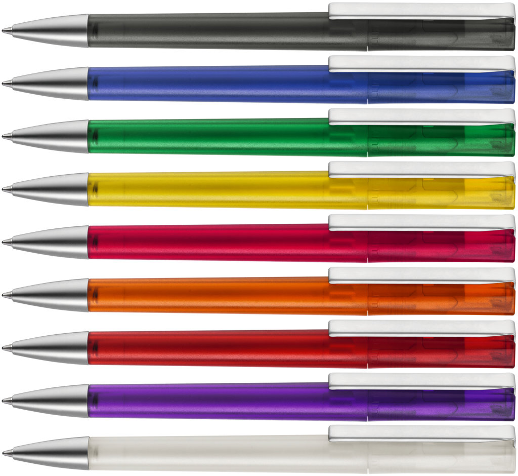 Farbiger Kugelschreiber aus Kunststoff, schwarzschreibend.Maße: ø10×138 mmSchreibgerät-Typ: KugelschreiberSchreibgerät-Mechanik: DruckmechanikSchreibfarbe: SchwarzMinentyp: Normale MineLinienstärke: 1 mmMaterial: KunststoffVeredelungsposition 1: Korpus - rechts vom ClipTechnologie: TampondruckMaximale Farben: 4Durchmesser: 0Druckcode: P0Technologie: TampondruckMaximale Farben: 1Durchmesser: 0Druckcode: P1Technologie: UV LED DruckDurchmesser: 0Druckcode: UVAVeredelungsposition 2: Korpus - links vom ClipTechnologie: TampondruckMaximale Farben: 4Durchmesser: 0Druckcode: P0Technologie: TampondruckMaximale Farben: 1Durchmesser: 0Druckcode: P1Technologie: UV LED DruckDurchmesser: 0Druckcode: UVAVeredelungsposition 3: KlipTechnologie: TampondruckMaximale Farben: 4Durchmesser: 0Druckcode: P0Veredelungsposition 4: Korpus - in Verlängerung vom ClipTechnologie: TampondruckMaximale Farben: 4Durchmesser: 0Druckcode: P0