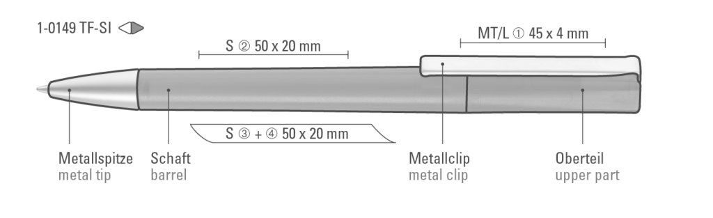 Druckbereich: Auf dem Clip 45mm x 4mm Lasergravur (L), auf dem Clip 45mm x 4mm Tampondruck (MT), in Clipverlängerung 50mm x 20mm Siebdruck (S), gegenüber vom Clip 50mm x 20mm Siebdruck (S), seitlich vom Clip 50mm x 20mm Siebdruck (S), auf dem Clip 45mm x 4mm Einzelnamensgravur (EL)