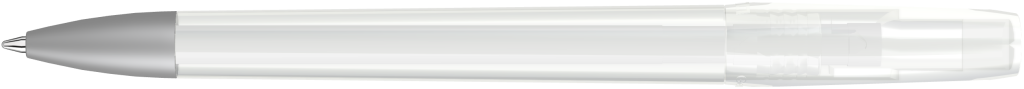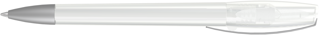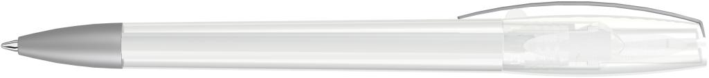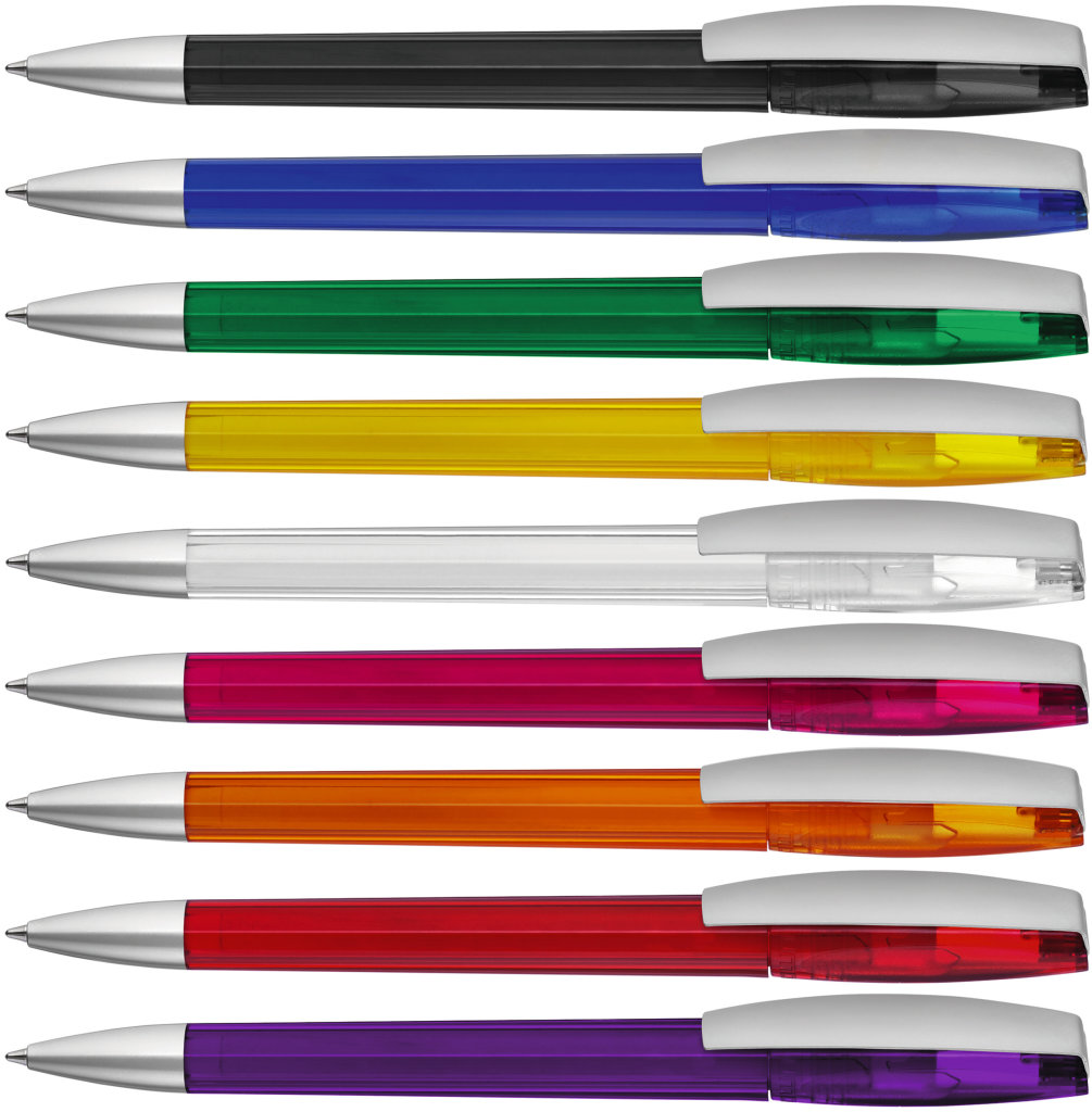 Druckkugelschreiber mit gedeckt glänzendem Gehäuse in weiß oder uni schwarz, farbig transparent glänzendem Innenschaft. Spitze und Drücker in silber glänzend.Druckbereich: Auf dem Clip 30mm x 7mm Tampondruck (T), in Clipverlängerung 45mm x 20mm Siebdruck (S), gegenüber vom Clip 45mm x 20mm Siebdruck (S), seitlich vom Clip 45mm x 20mm Siebdruck (S)