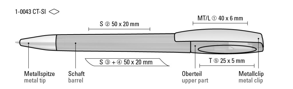 Druckbereich: Auf dem Clip 40mm x 6mm Lasergravur (L), auf dem Clip 40mm x 6mm Tampondruck (MT), in Clipverlängerung 50mm x 20mm Siebdruck (S), gegenüber vom Clip 50mm x 20mm Siebdruck (S), seitlich vom Clip 50mm x 20mm Siebdruck (S), auf der Kappe/auf dem Oberteil 25mm x 5mm Tampondruck (T), auf dem Clip 40mm x 6mm Einzelnamensgravur (EL)