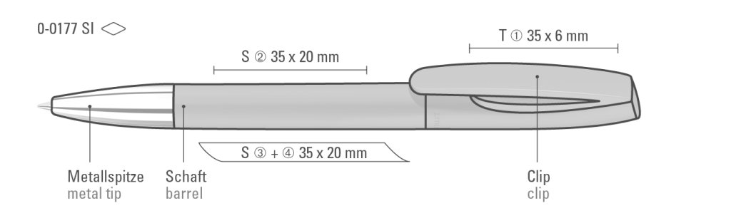 Druckbereich: Auf dem Clip 35mm x 6mm Tampondruck (T), in Clipverlängerung 35mm x 20mm Siebdruck (S), gegenüber vom Clip 35mm x 20mm Siebdruck (S), seitlich vom Clip 35mm x 20mm Siebdruck (S)